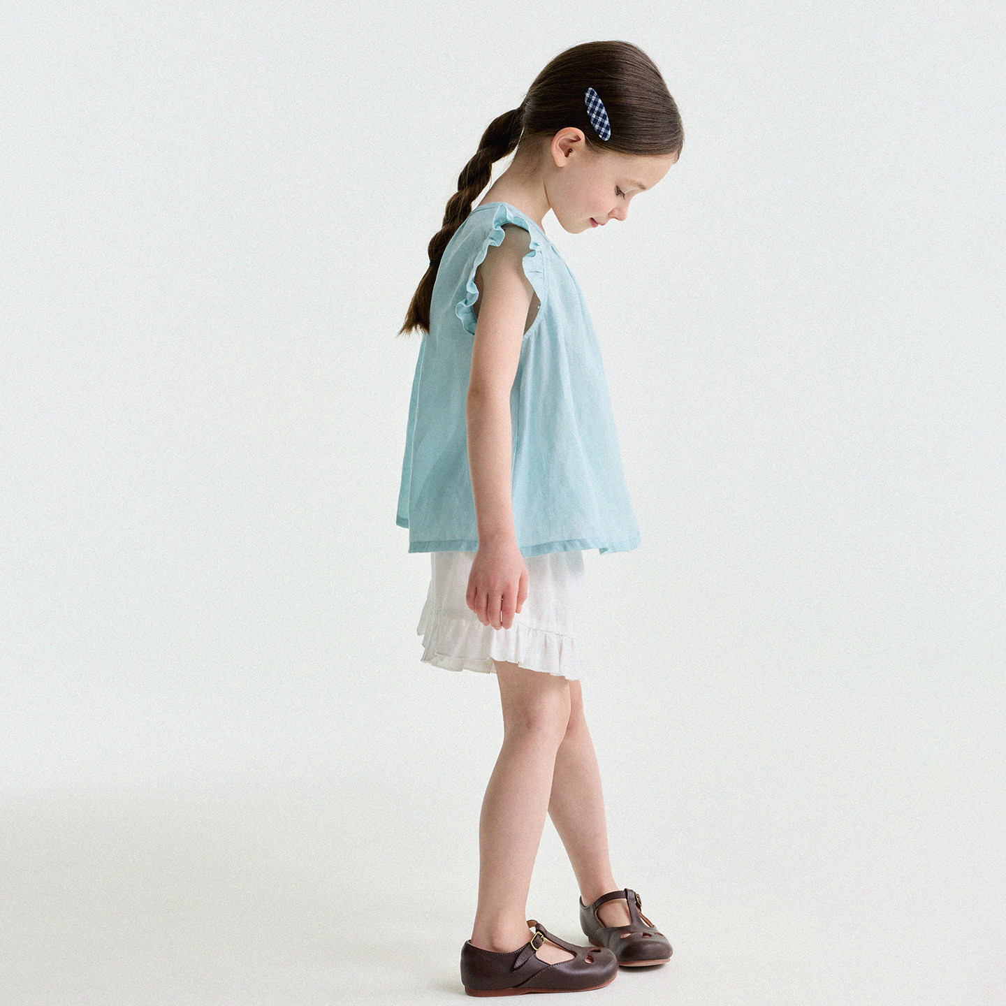植木【柿熟时分】假两件格子衫 拼接露肩设计 女童上衣26春夏童装
