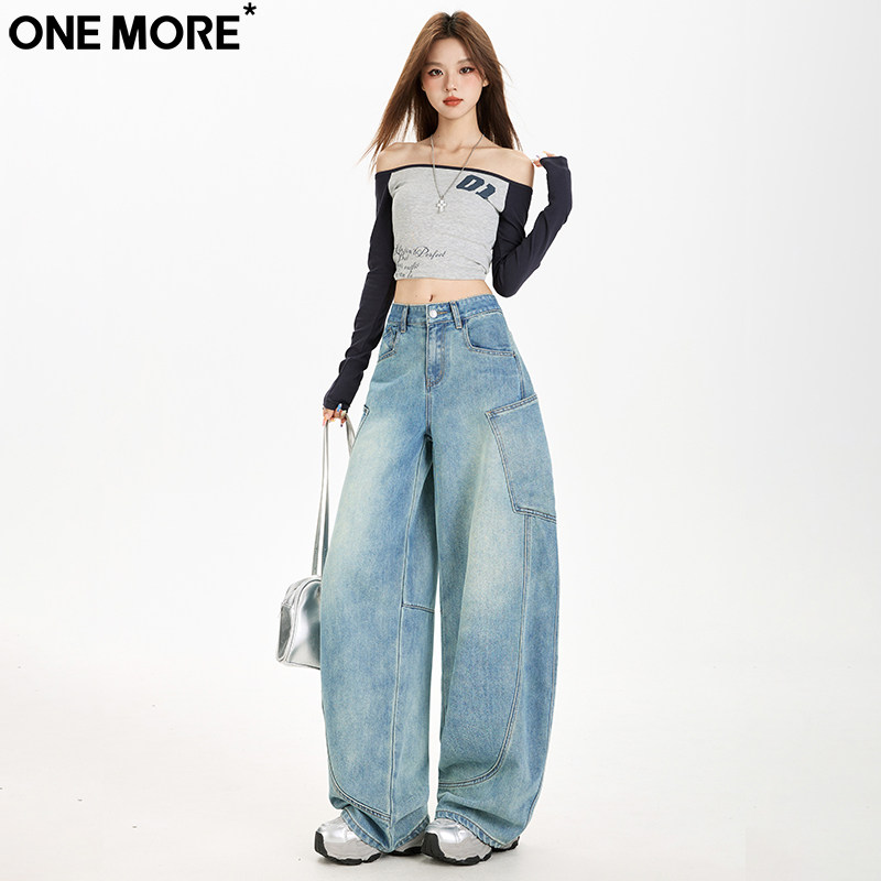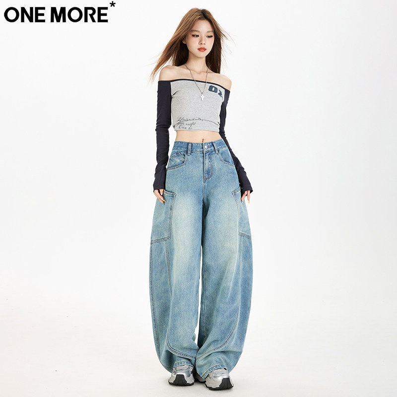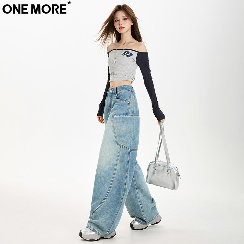 One More欧美百搭工装弯刀牛仔裤女秋冬季新款宽松阔腿直筒镰刀裤
