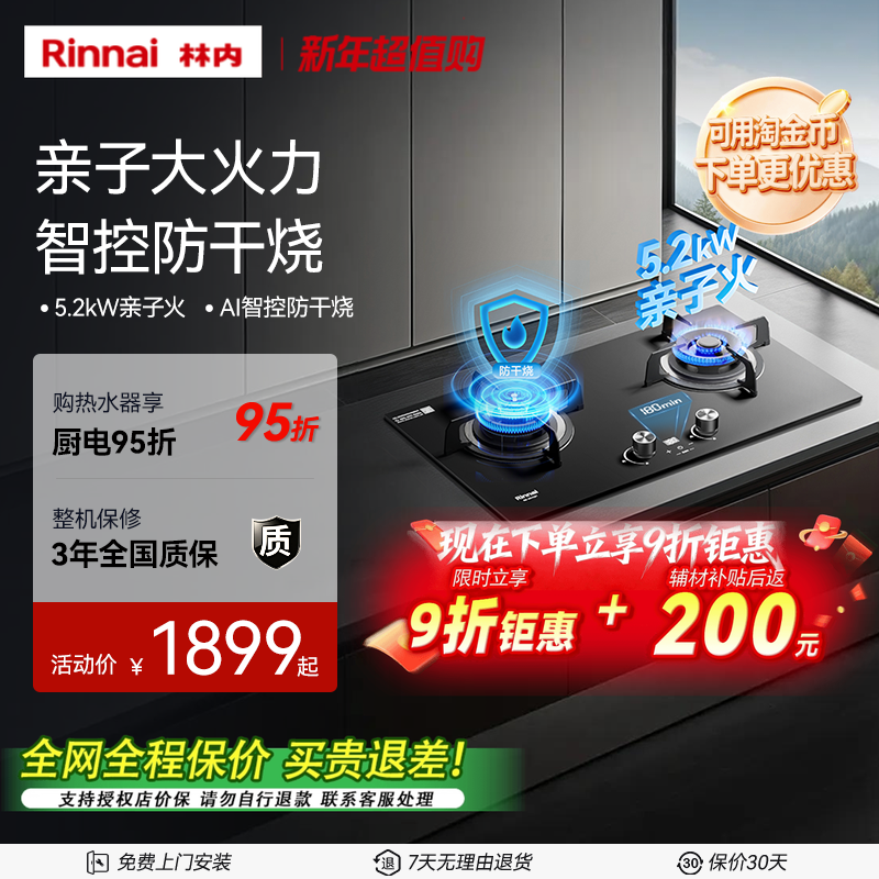 新品上市林内Rinnai烟灶套装亲子火定时防干烧2EHQS1/QS2+13EA