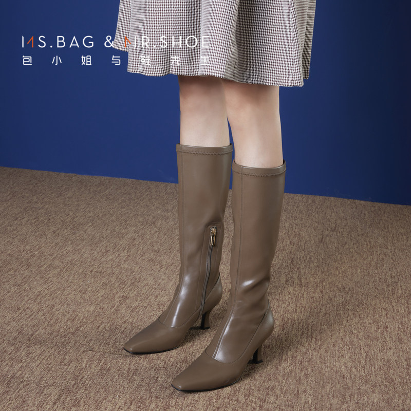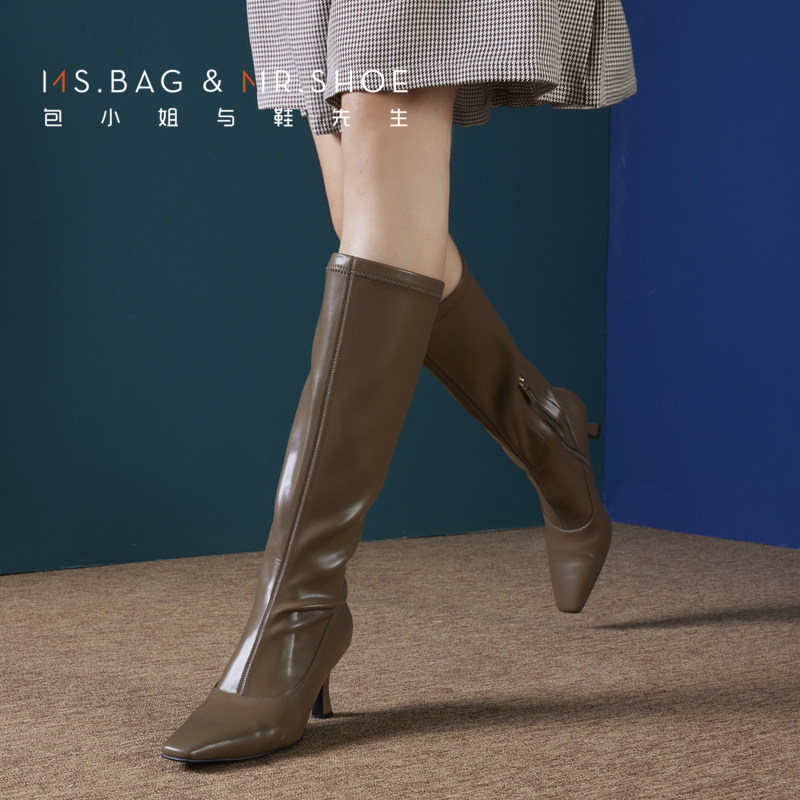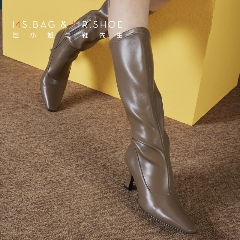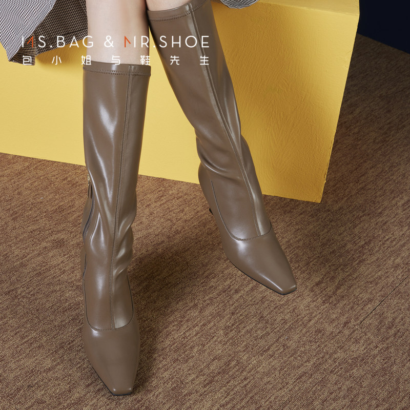 包小姐与鞋先生冬款方头细跟仿真皮弹力包腿长筒靴女