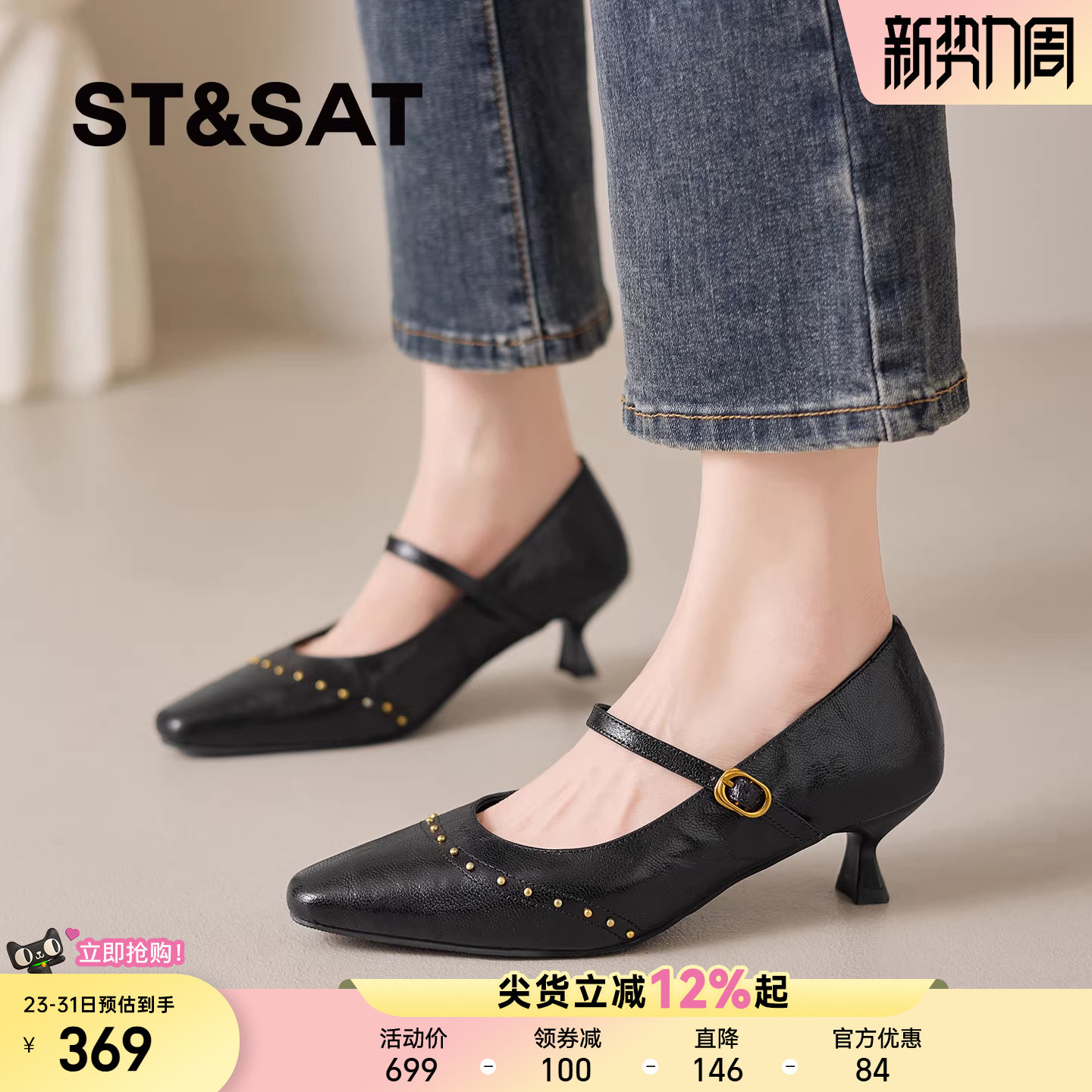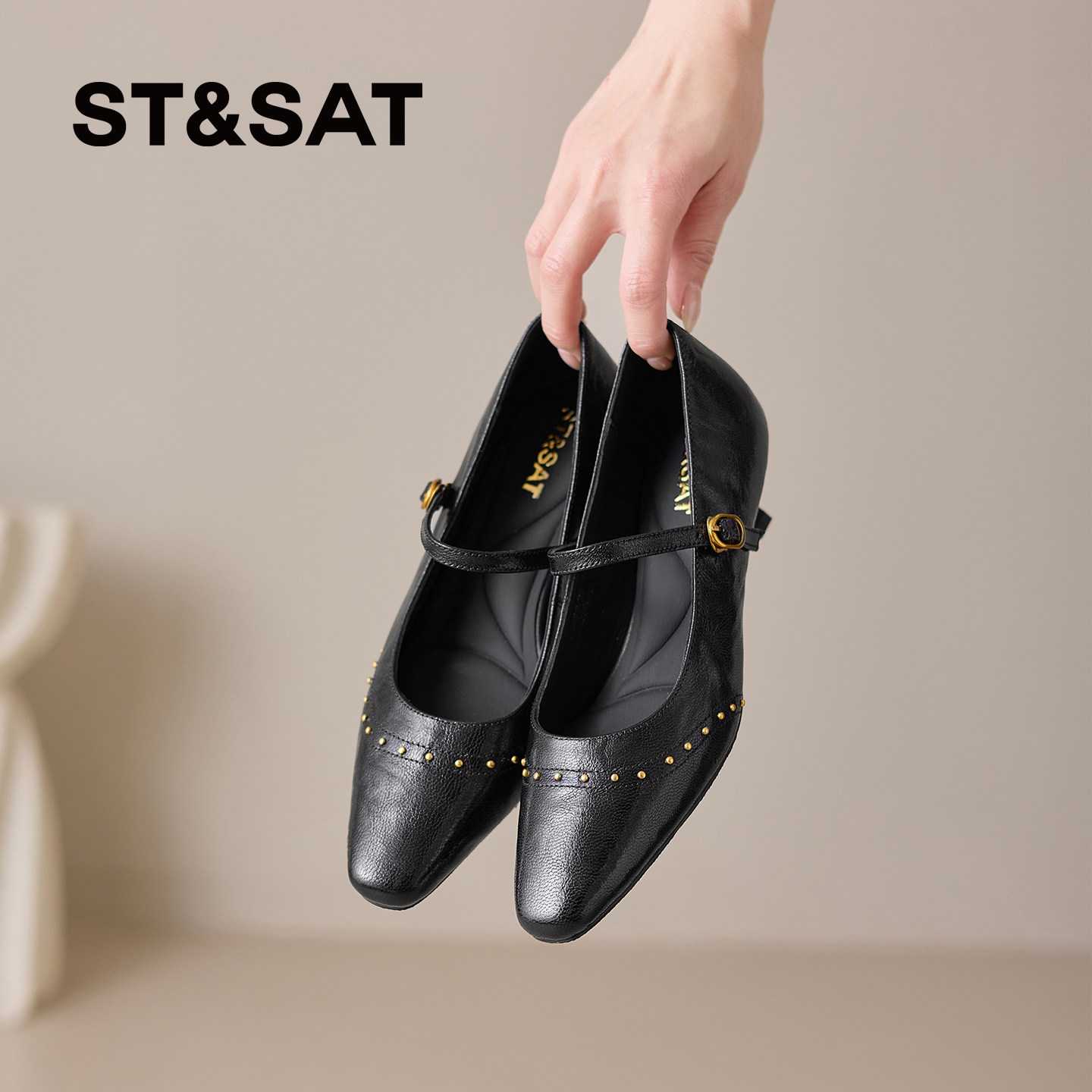 星期六2026年超火的鞋子黑色铆钉玛丽珍鞋女一字扣带细跟软底单鞋