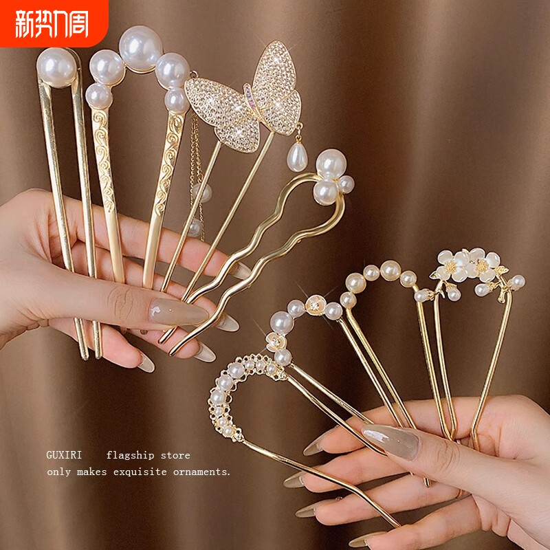高级感珍珠u型发簪女2024新款新中式簪子古风盘发神器头饰流苏