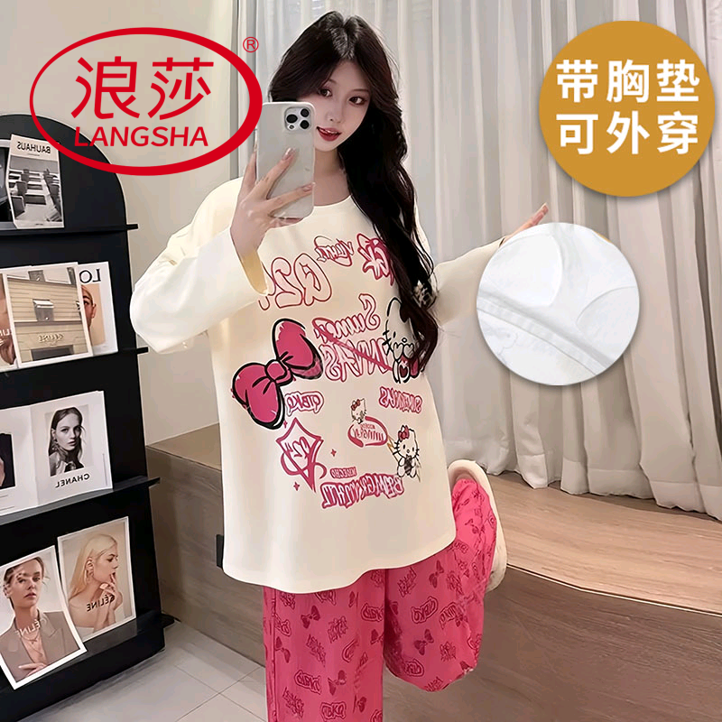 2025新款带胸垫睡衣女春秋季棉质薄款长袖长裤家居服套装可外穿