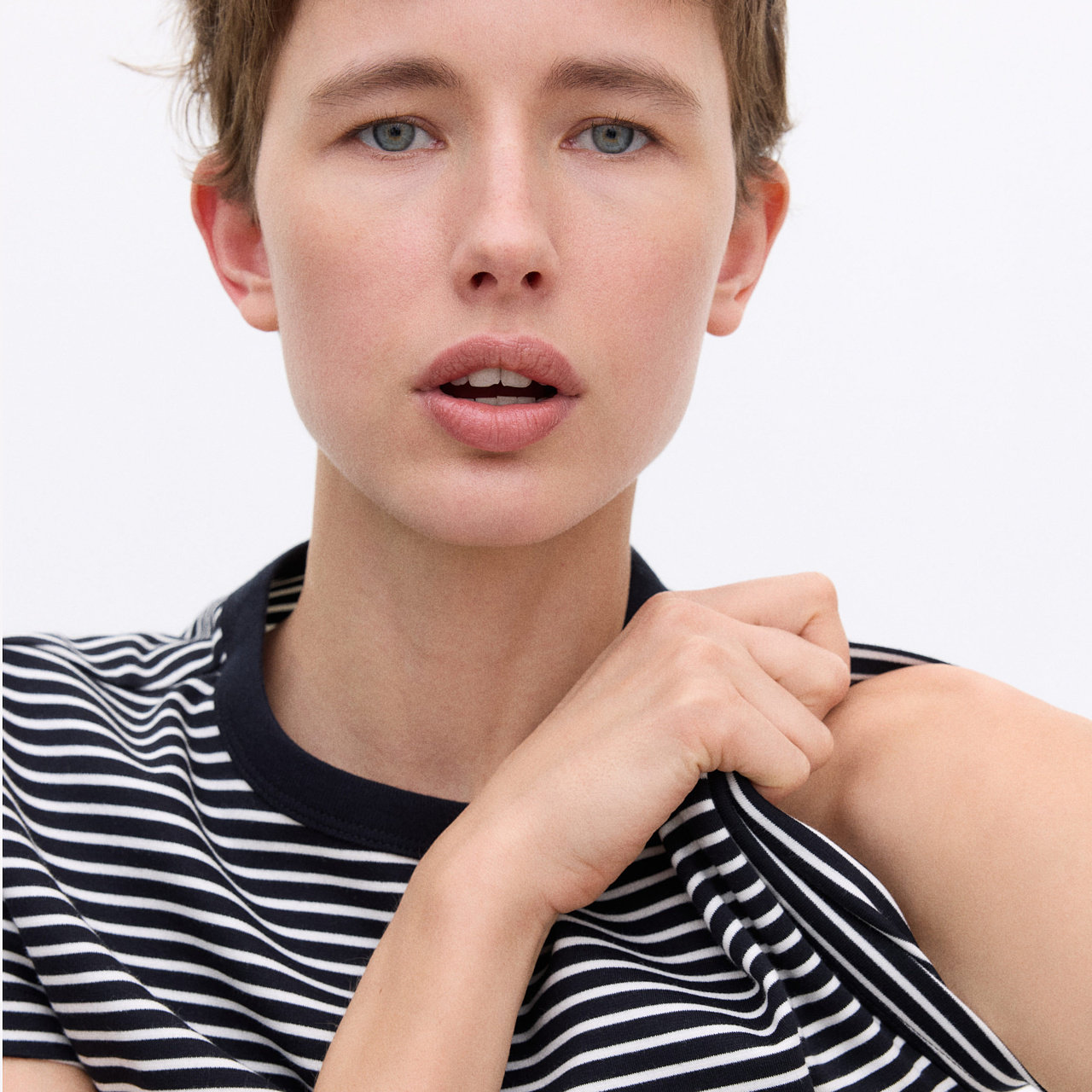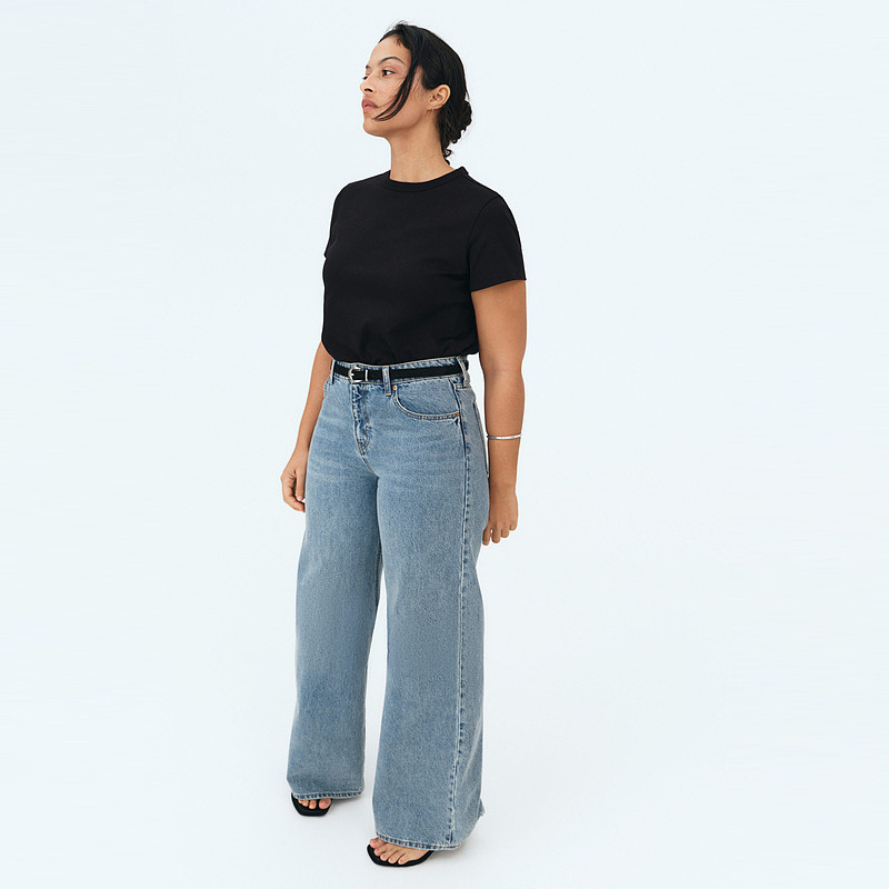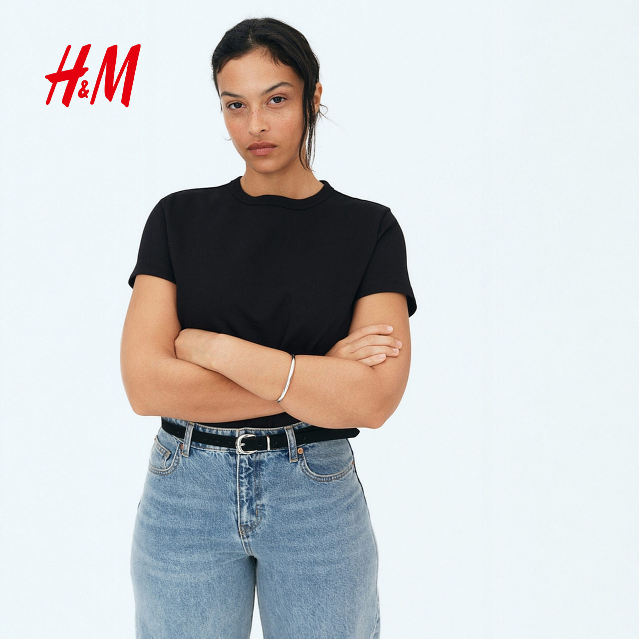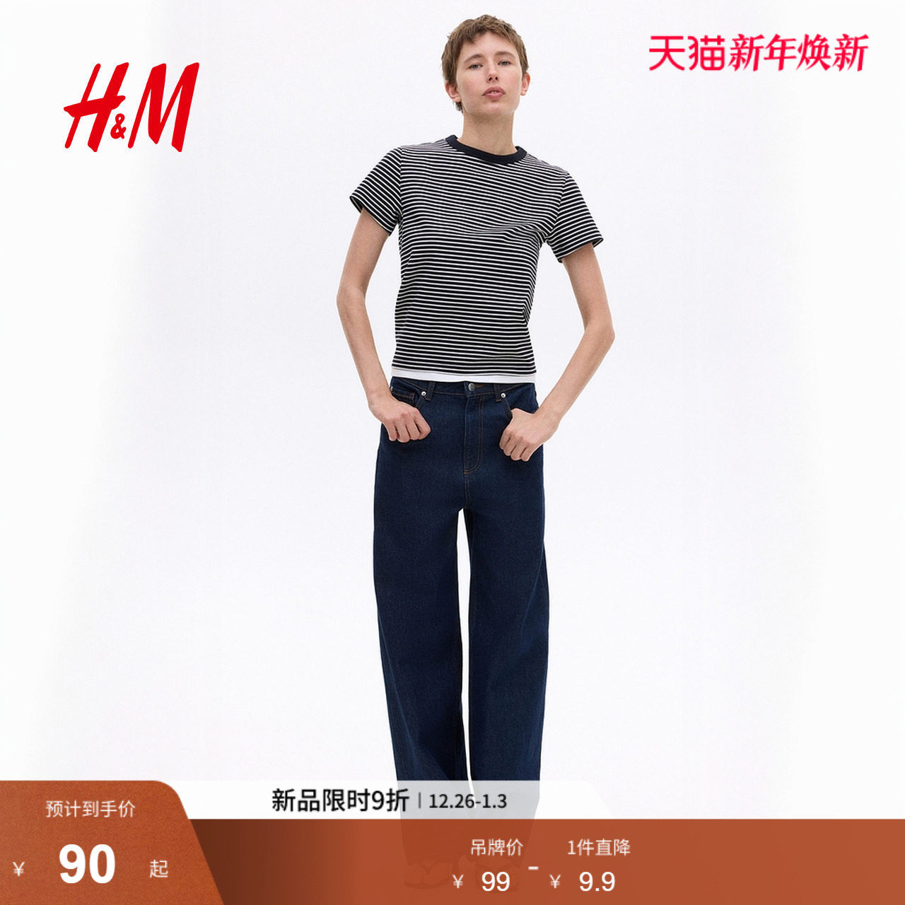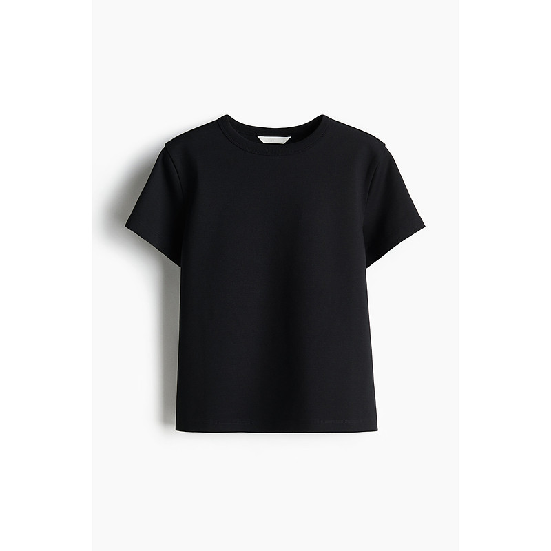 HM女装T恤2025冬季新款罗纹圆领短袖宽松休闲舒适棉质上衣1264833