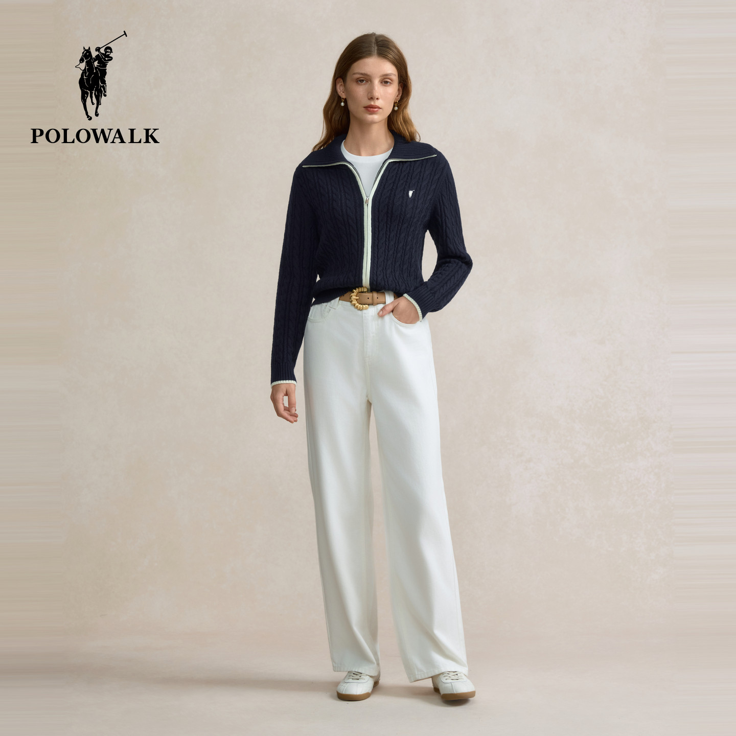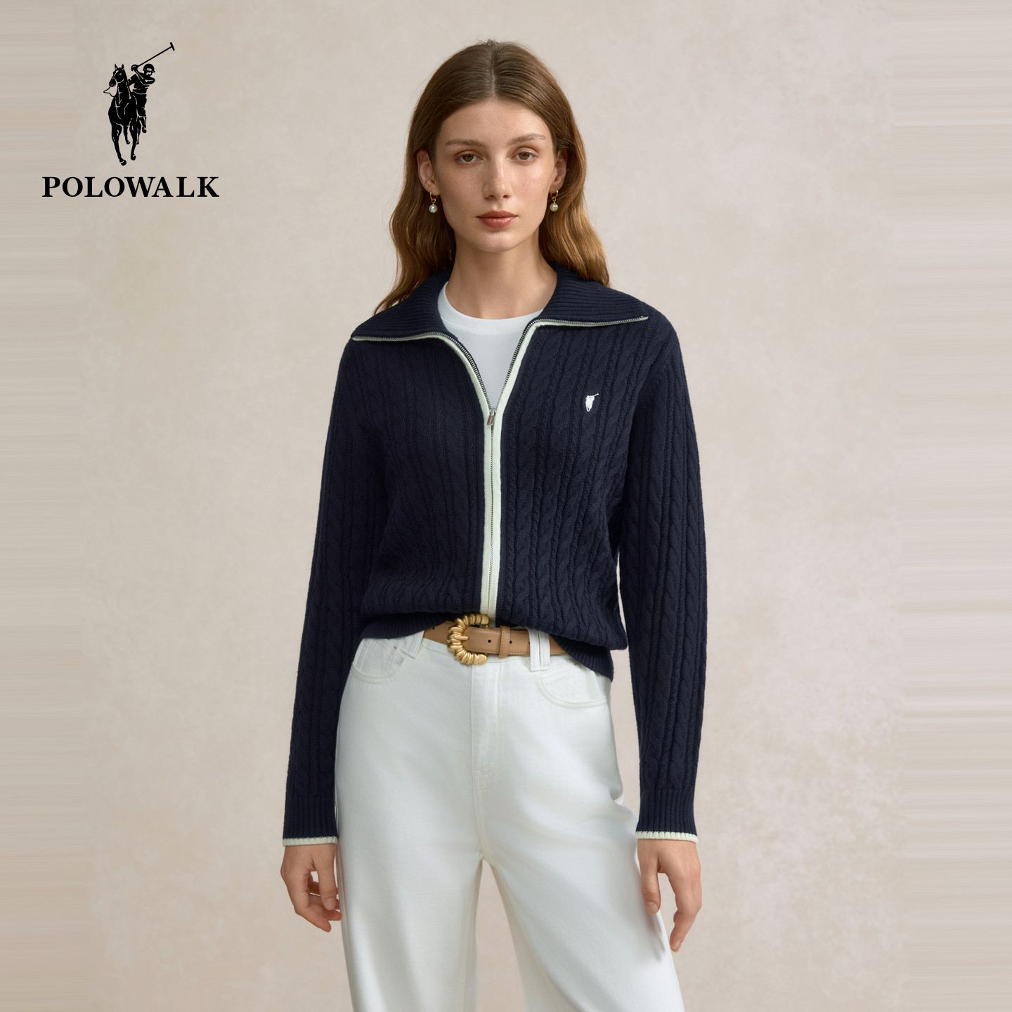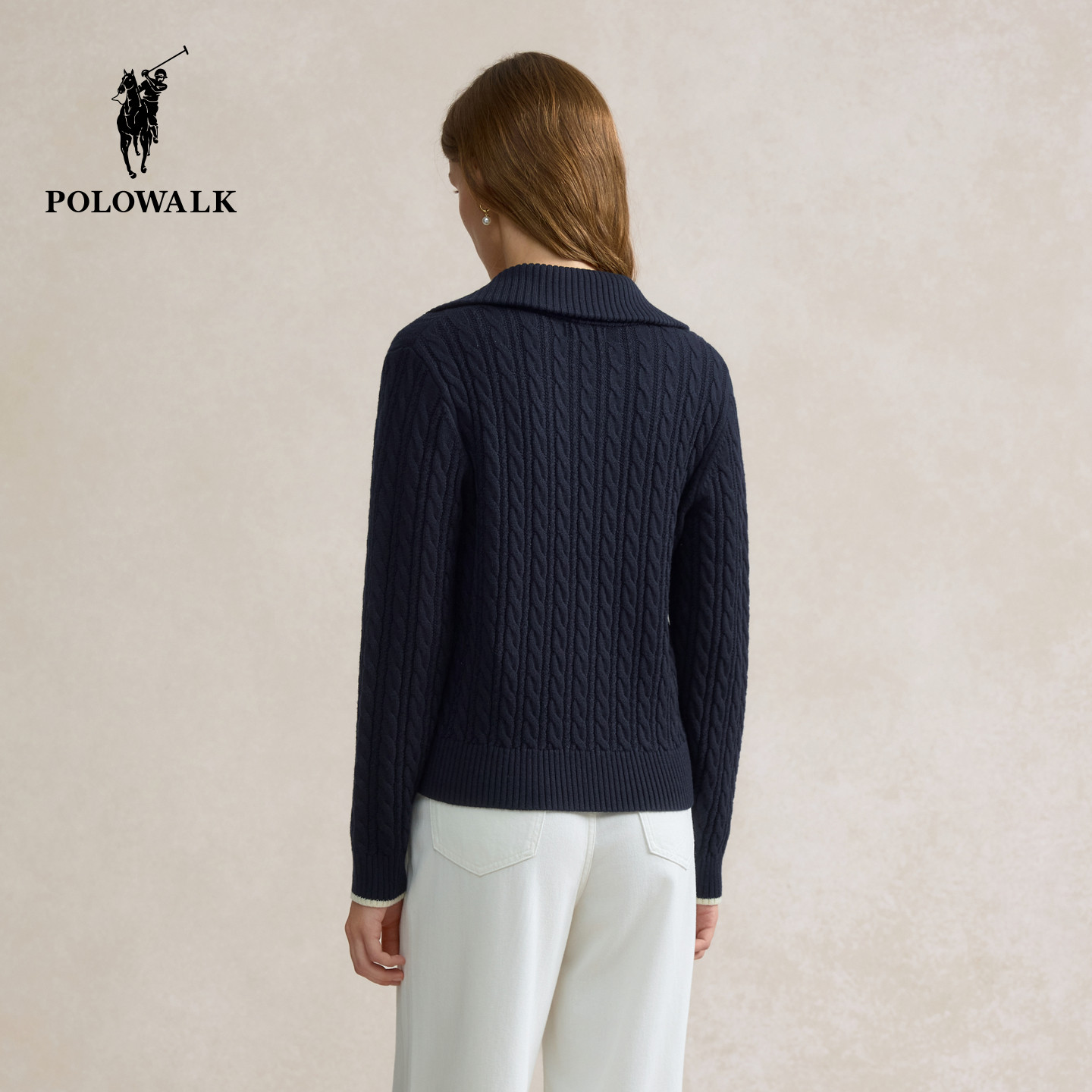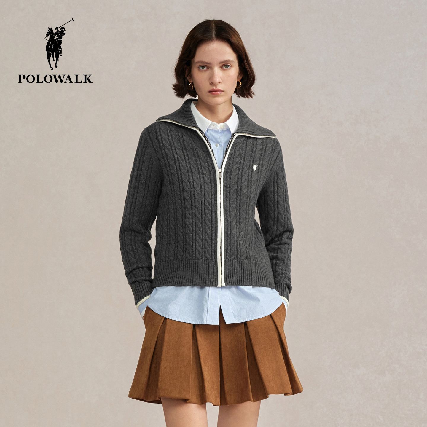 【含绵羊毛】POLOWALK女式长袖针织衫2025秋季新品绞花翻领外套女