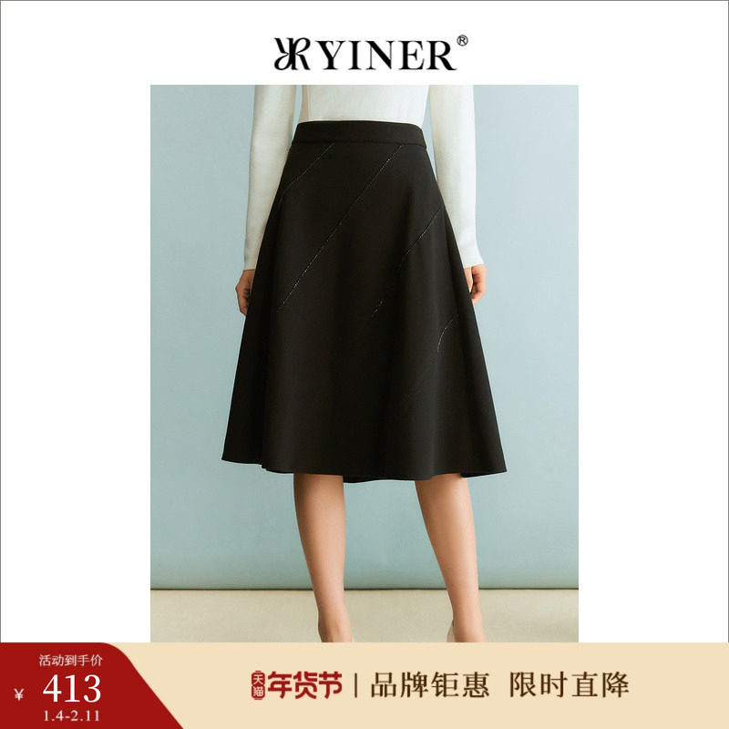 YINER音儿专选女装冬季法式优雅钉珠织条高腰A字半身裙小黑裙