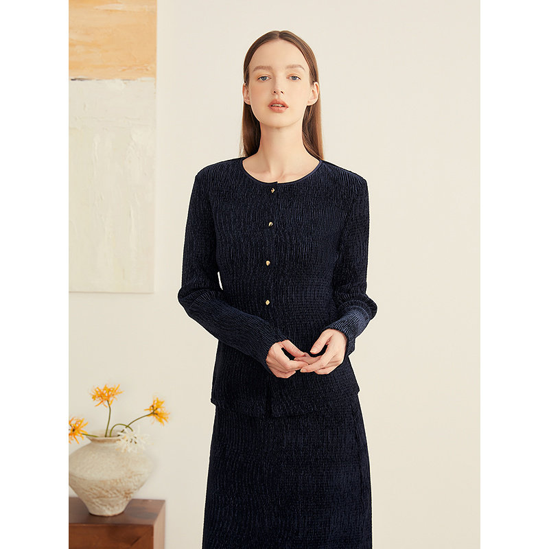 YINER音儿专选2025秋季新款法式手工褶艺收腰圆领丝绒衬衫上衣