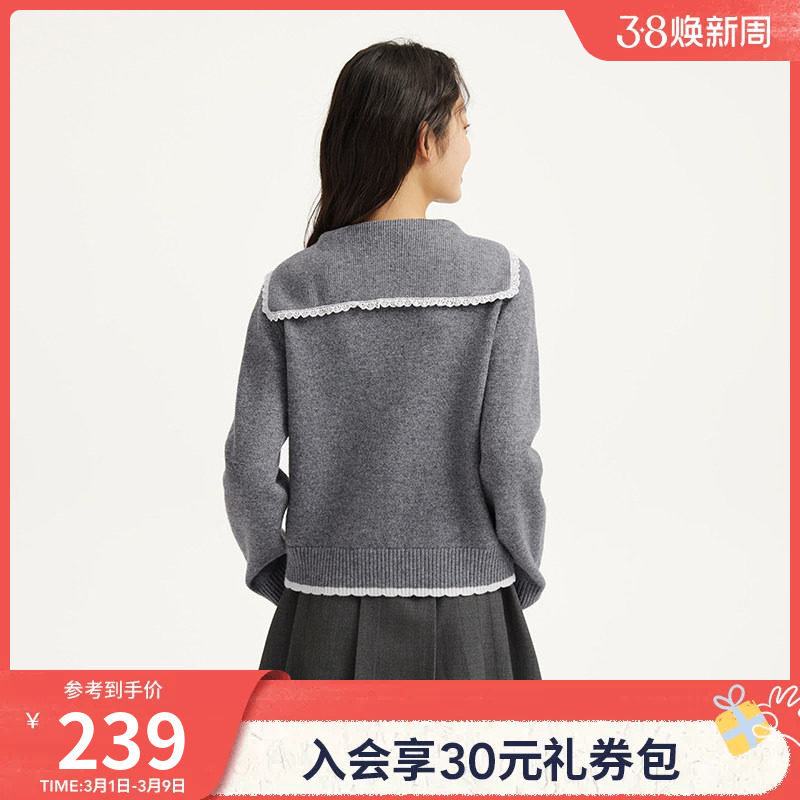 热风2026年春季新款女士甜美学院风翻领针织开衫含羊毛