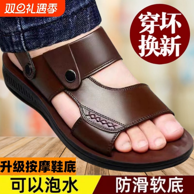 老人头凉鞋男2025夏季牛皮休闲外穿沙滩鞋真皮防滑中老年爸爸拖鞋