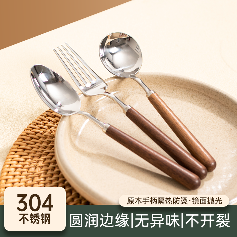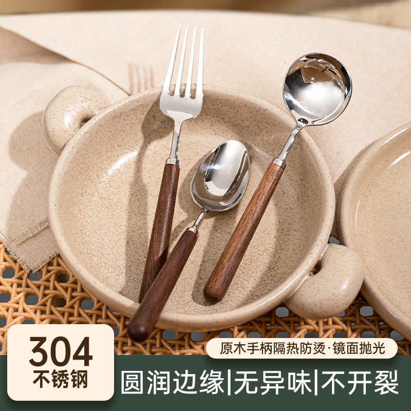 木柄勺子不锈钢食品级家用高档精致吃饭汤匙长柄叉子喝汤勺