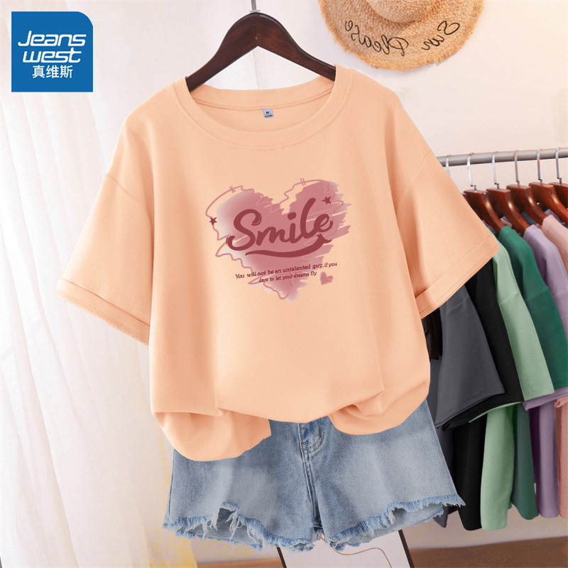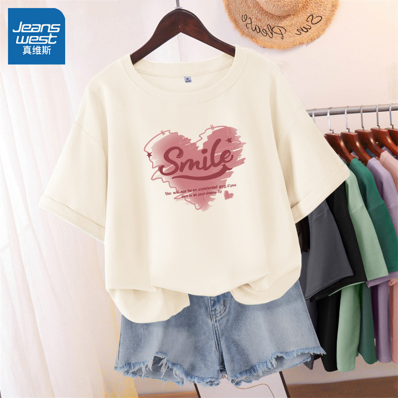KHV真维斯纯棉粉色t恤女短袖夏2023新款爆款宽松遮肉显瘦爱心半袖