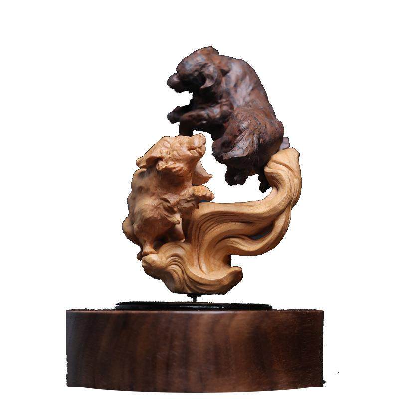 太阳能旋转汽车摆件黄杨木雕旺财狗旺旺生财车载招财饰品中式木艺