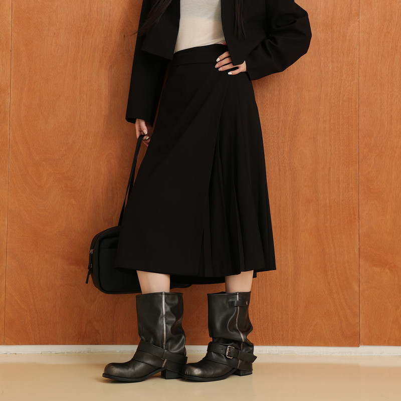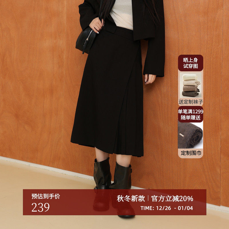 黑标BAIZHUO秋季新款休闲高腰a字叠搭设计感长款半身裙AZ43BQ299