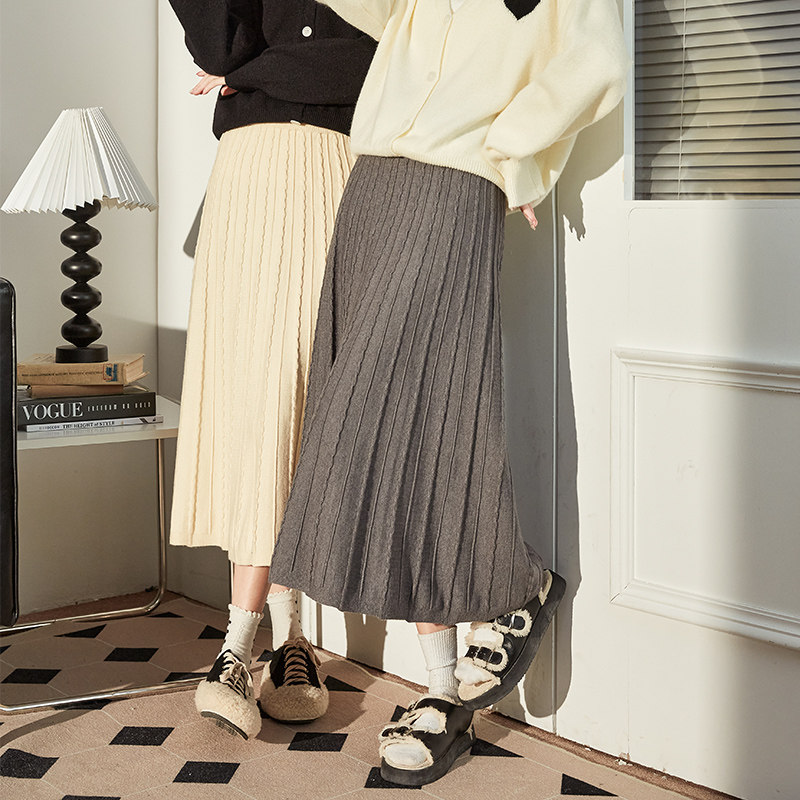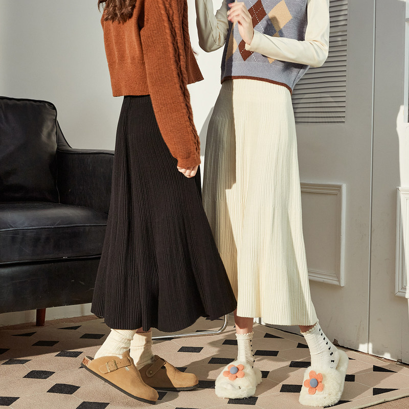 秋冬羊绒半身裙女秋冬新款中长高腰显瘦百褶大摆裙A字针织羊毛裙