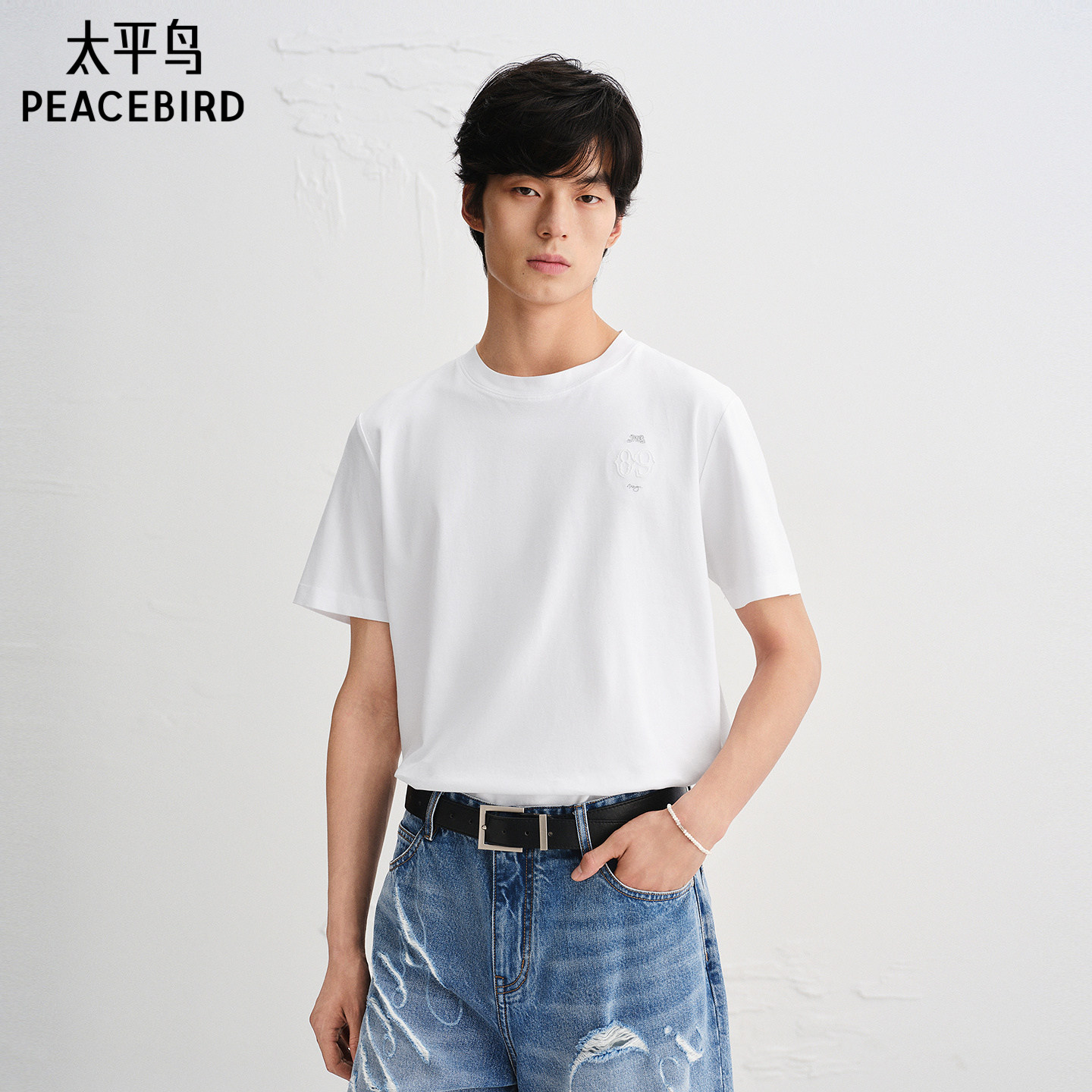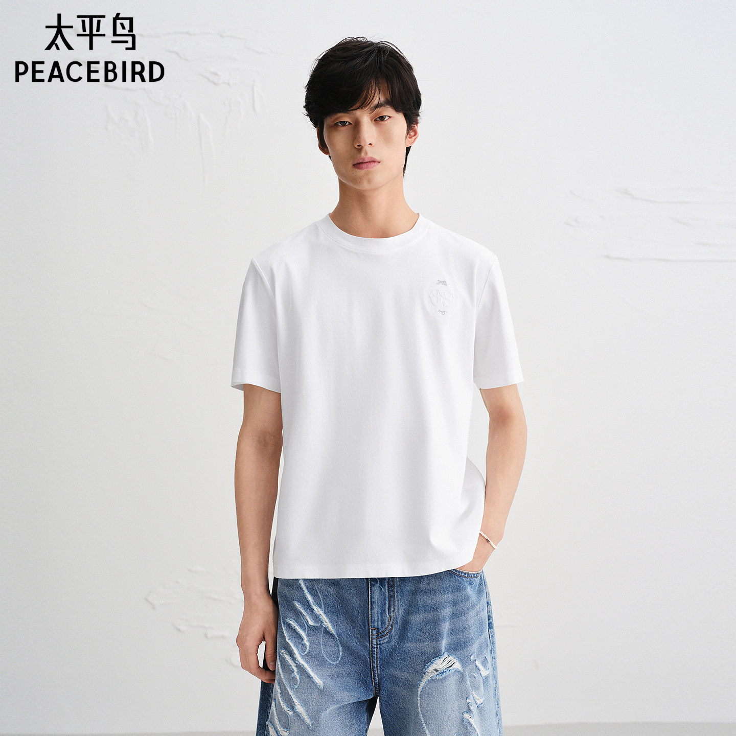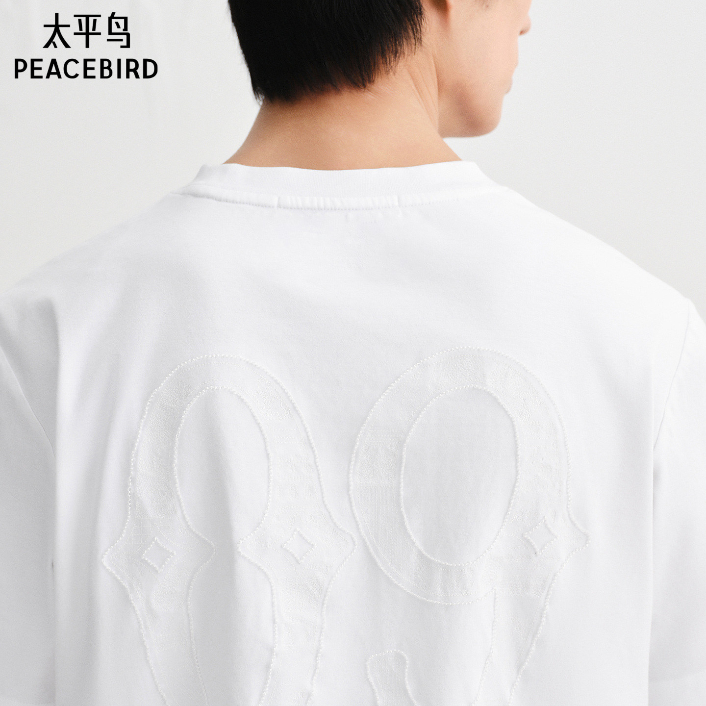 太平鸟男装 白色圆领体恤男双面布韩版时尚纯色刺绣夏季短袖T恤