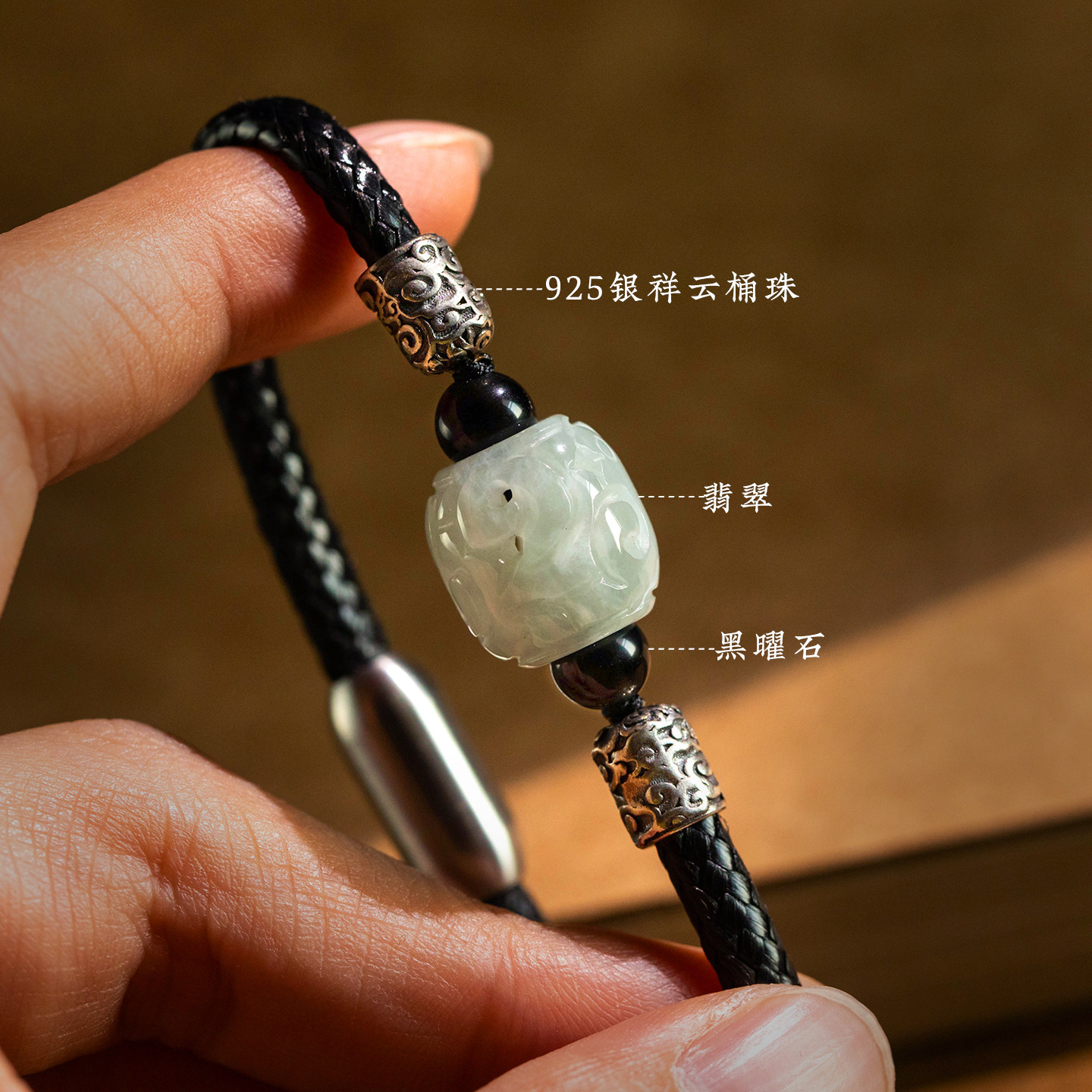 大善堂翡翠手工编织手绳纯银黑曜石手链本命年好运手饰品情侣礼物