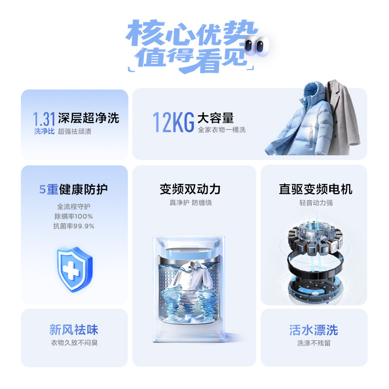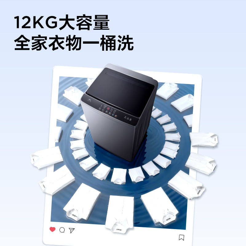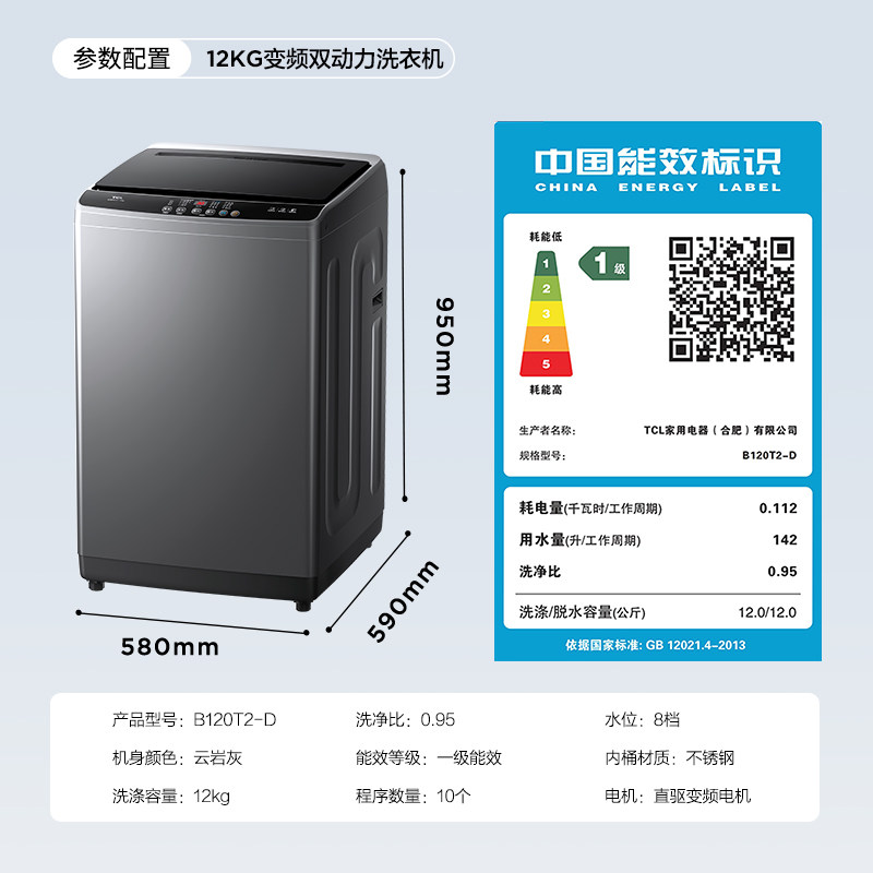 TCL B120T2-D 12KG双动力波轮洗衣机T2直驱电机抗菌除螨 一级能效