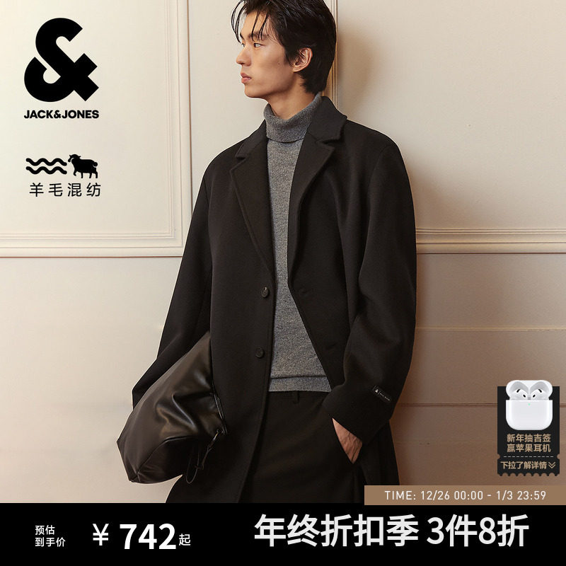 杰克琼斯中长款含羊毛大衣男新款纯色静奢羊髦柴斯特大衣外套男装