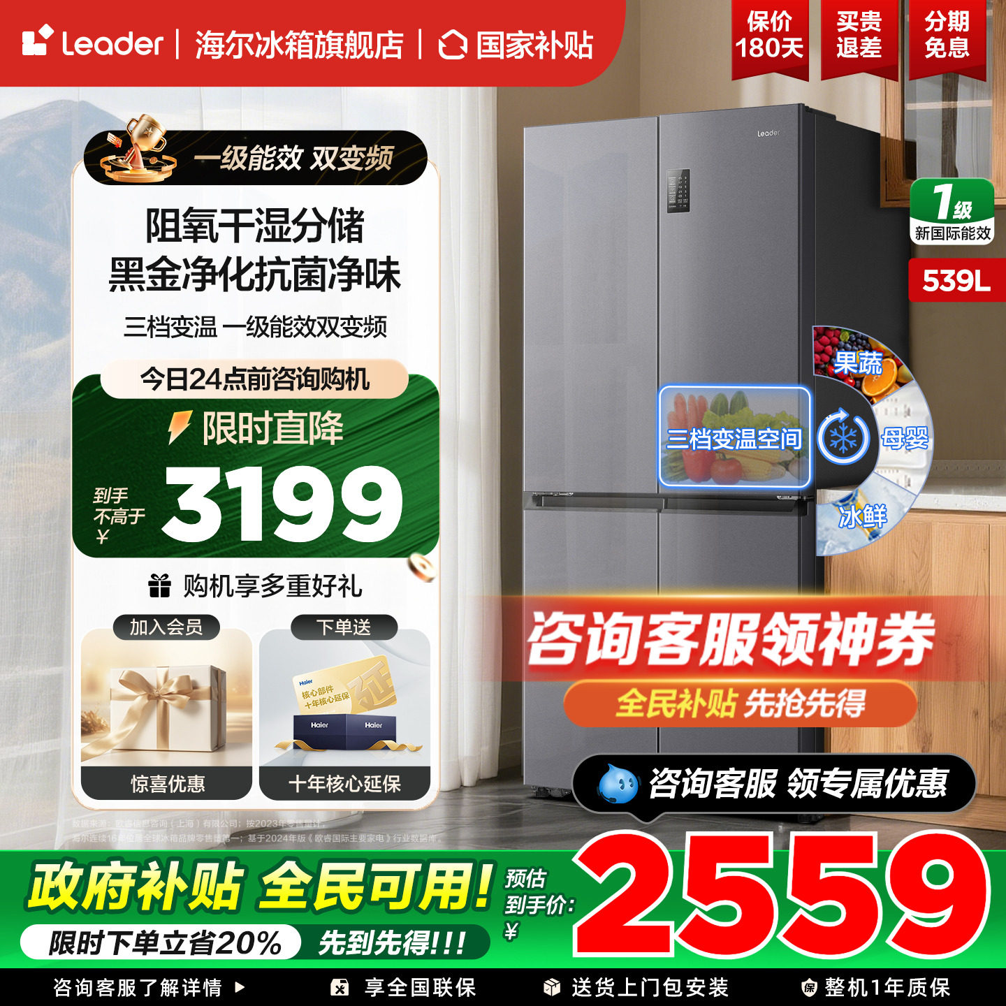【国补告急】海尔出品统帅冰箱539升十字四开门一级变频官方正品