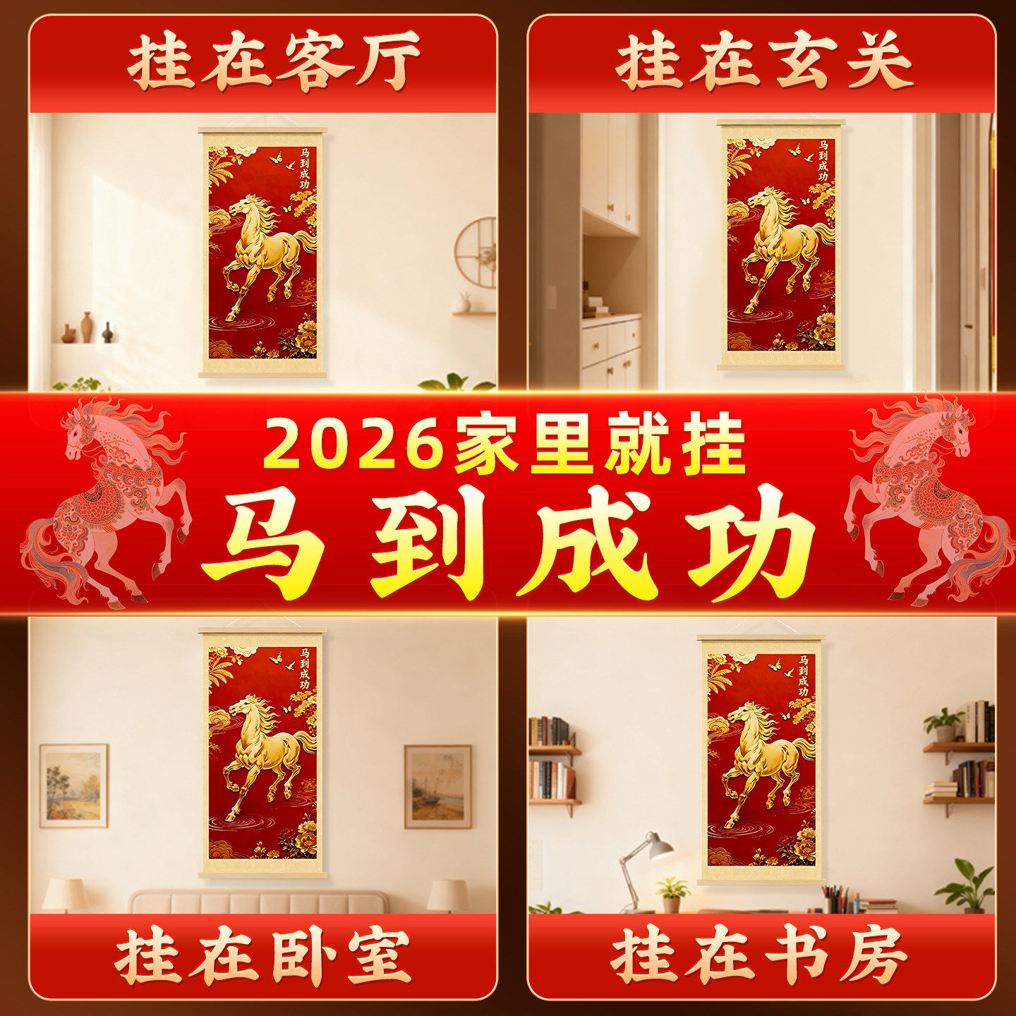 2026新款马到成功挂画件马年吉祥卷轴装饰画客厅玄关沙发背景墙壁