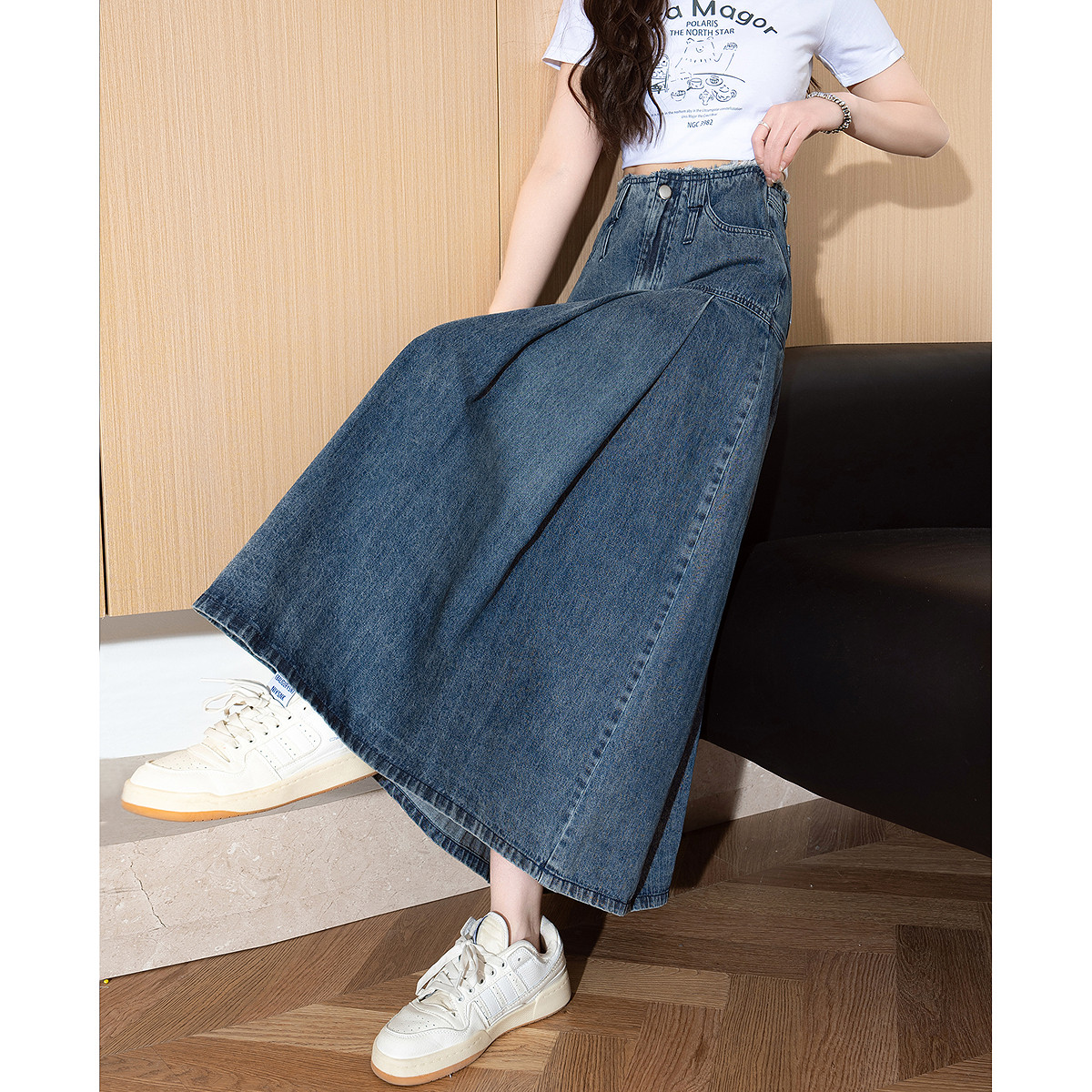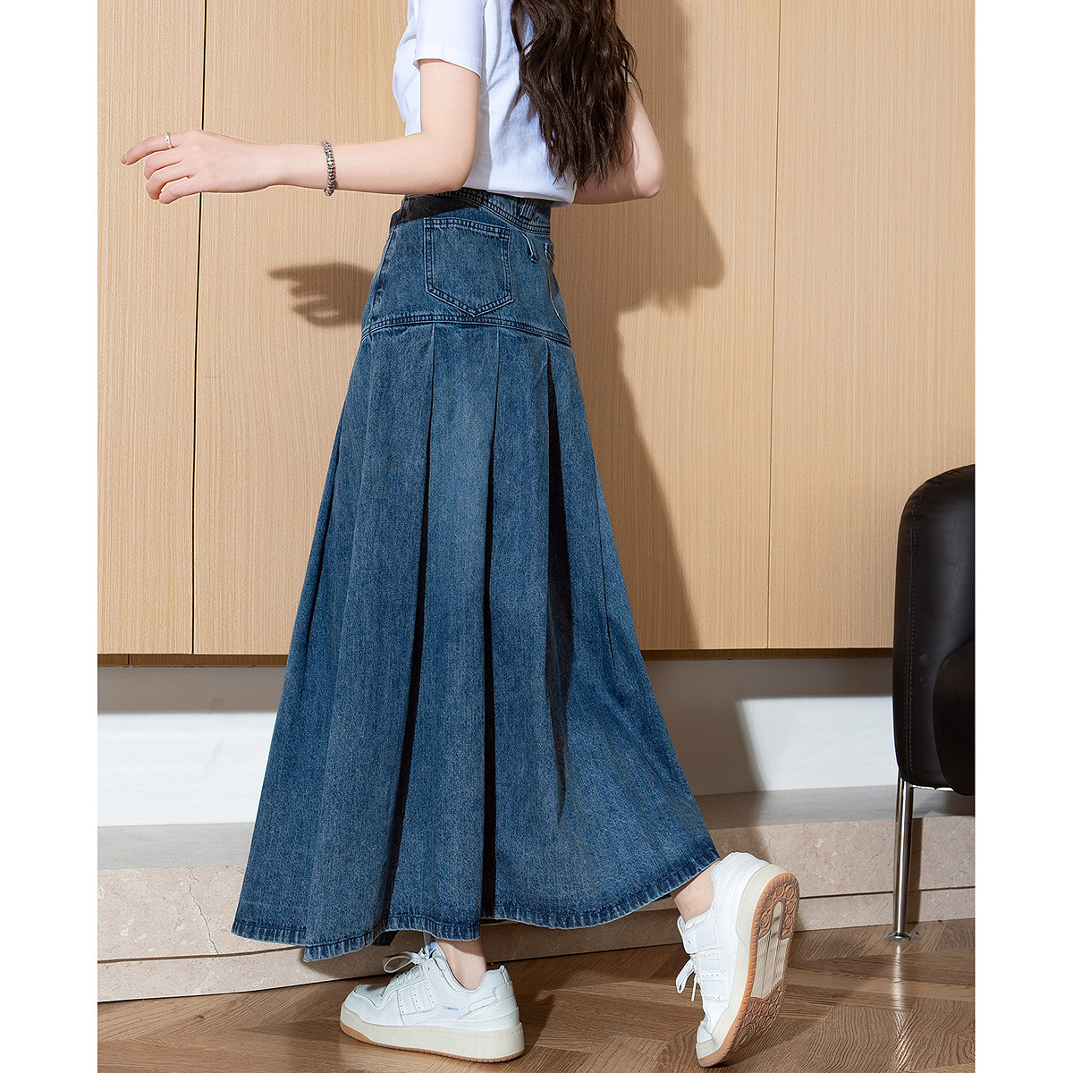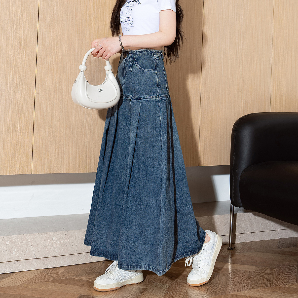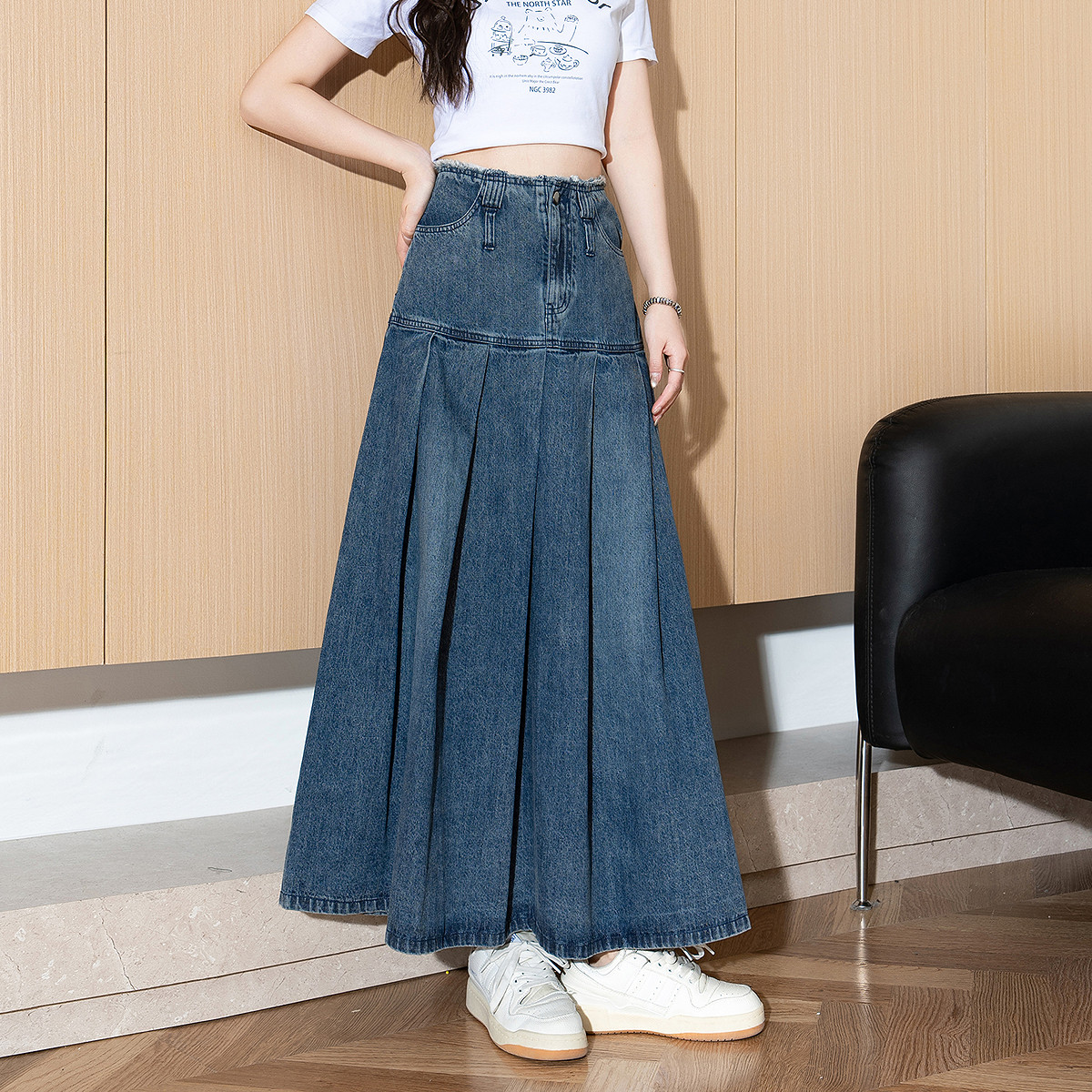 唐狮春夏季新款女半身裙宽松水洗百褶牛仔半身长裙高腰显瘦TE