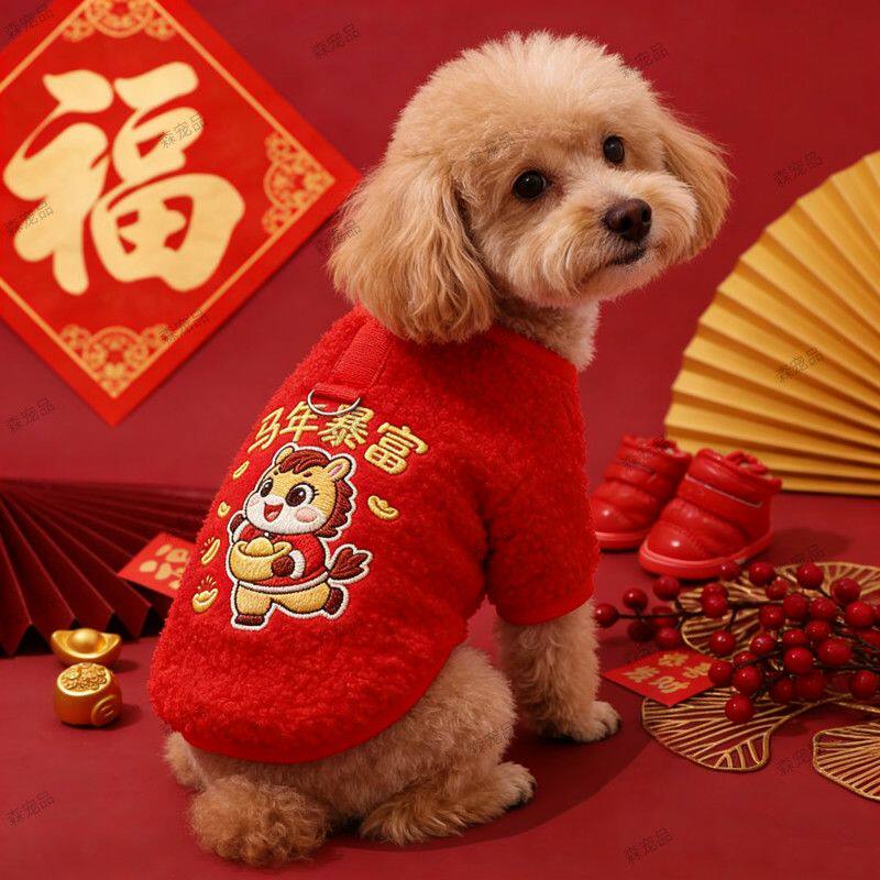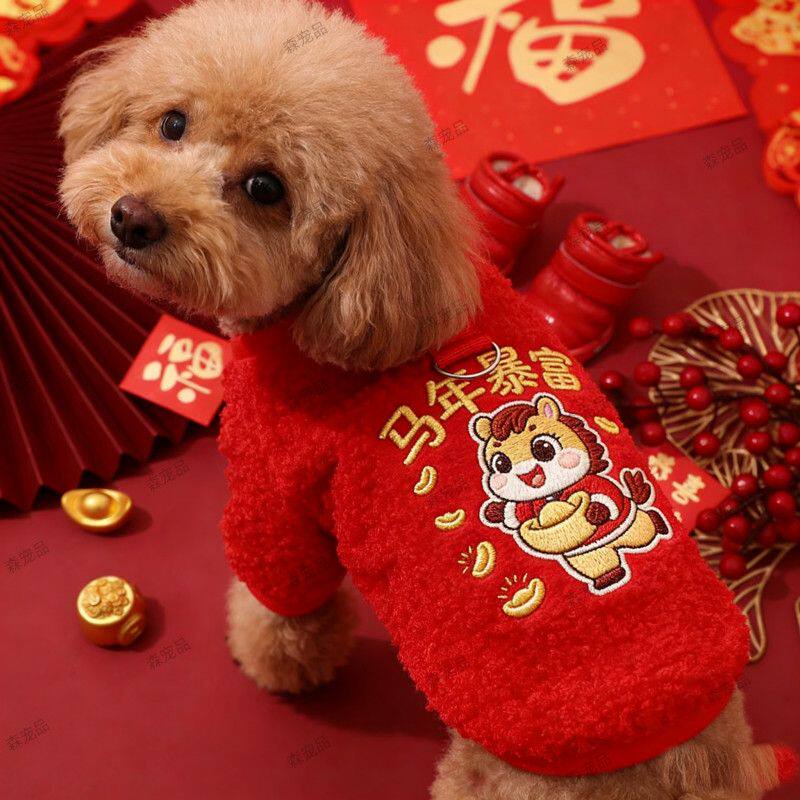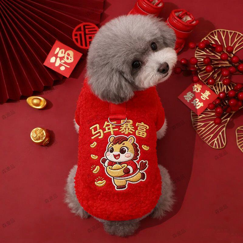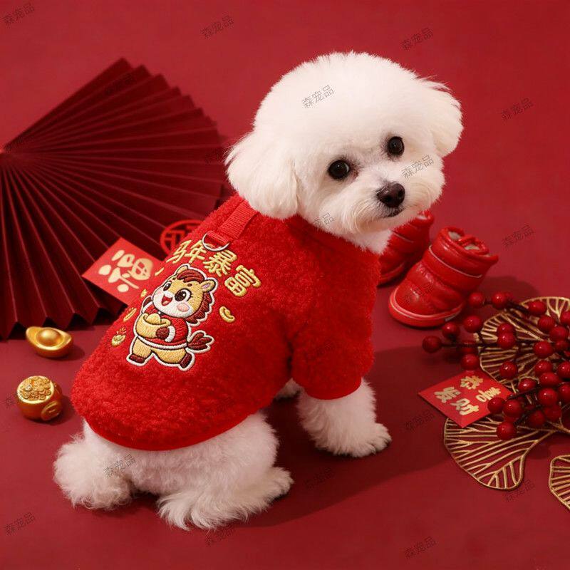 宠物新年衣服可爱刺绣猫咪小型犬棉衣秋冬季喜庆背心狗狗牵引绒衣