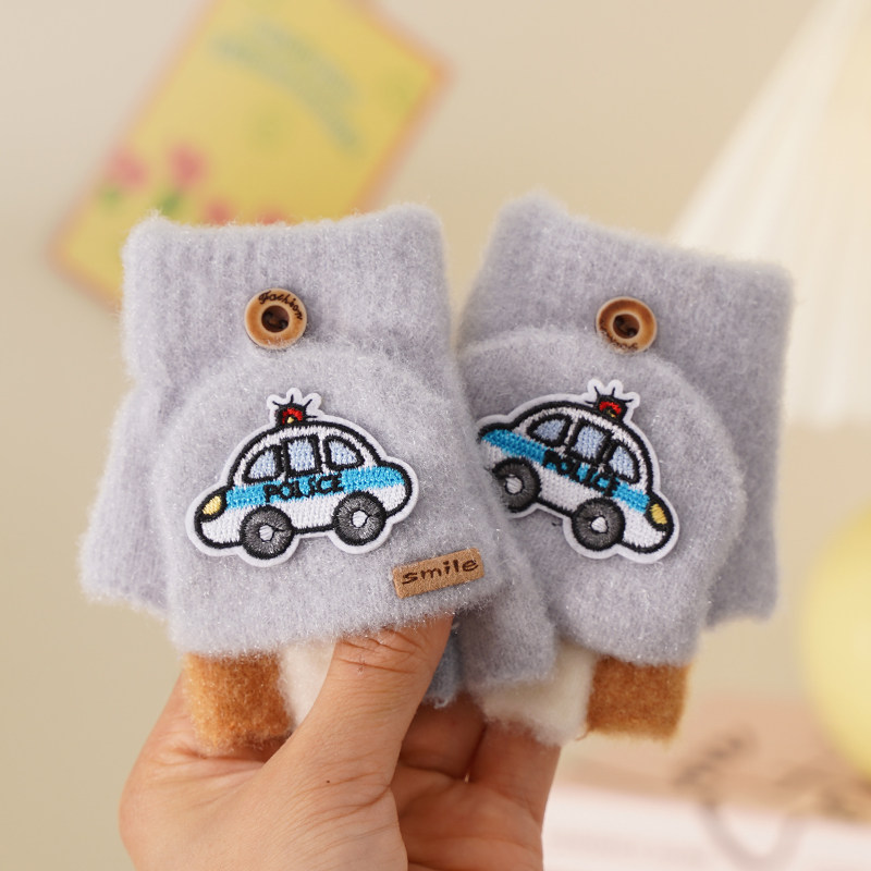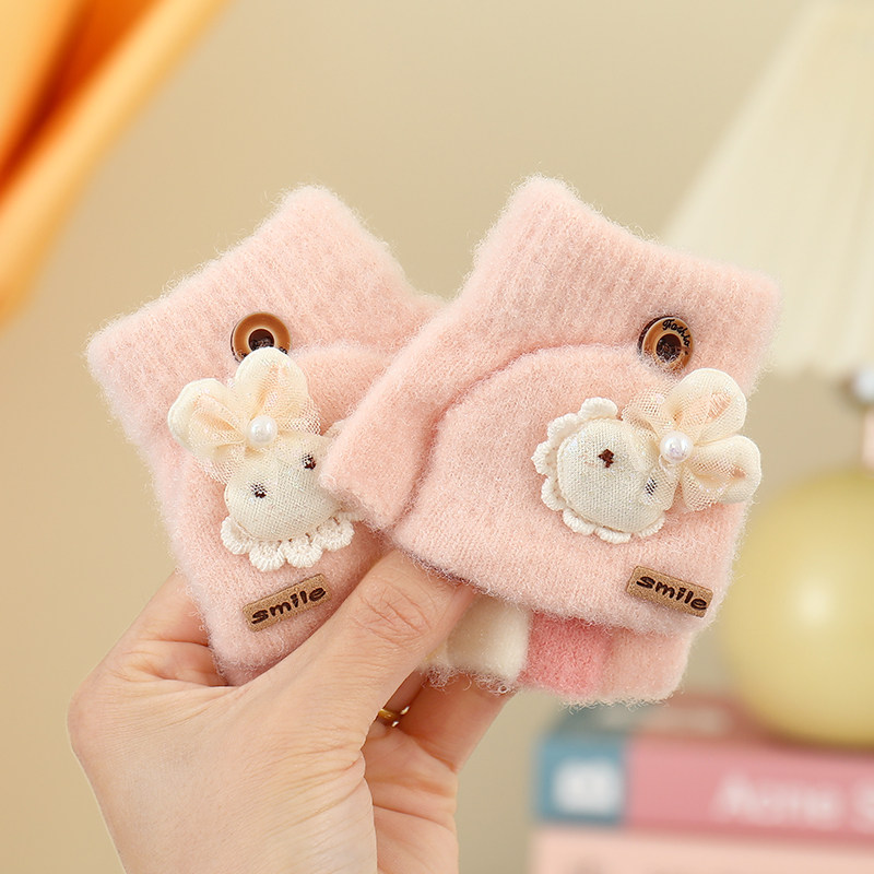 儿童手套半指翻盖冬天季保暖毛绒小学生女孩男童宝宝可爱露指写字