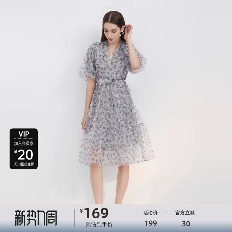 sdeer圣迪奥女装秋V领碎花收腰泡泡袖连衣裙S223Z120E