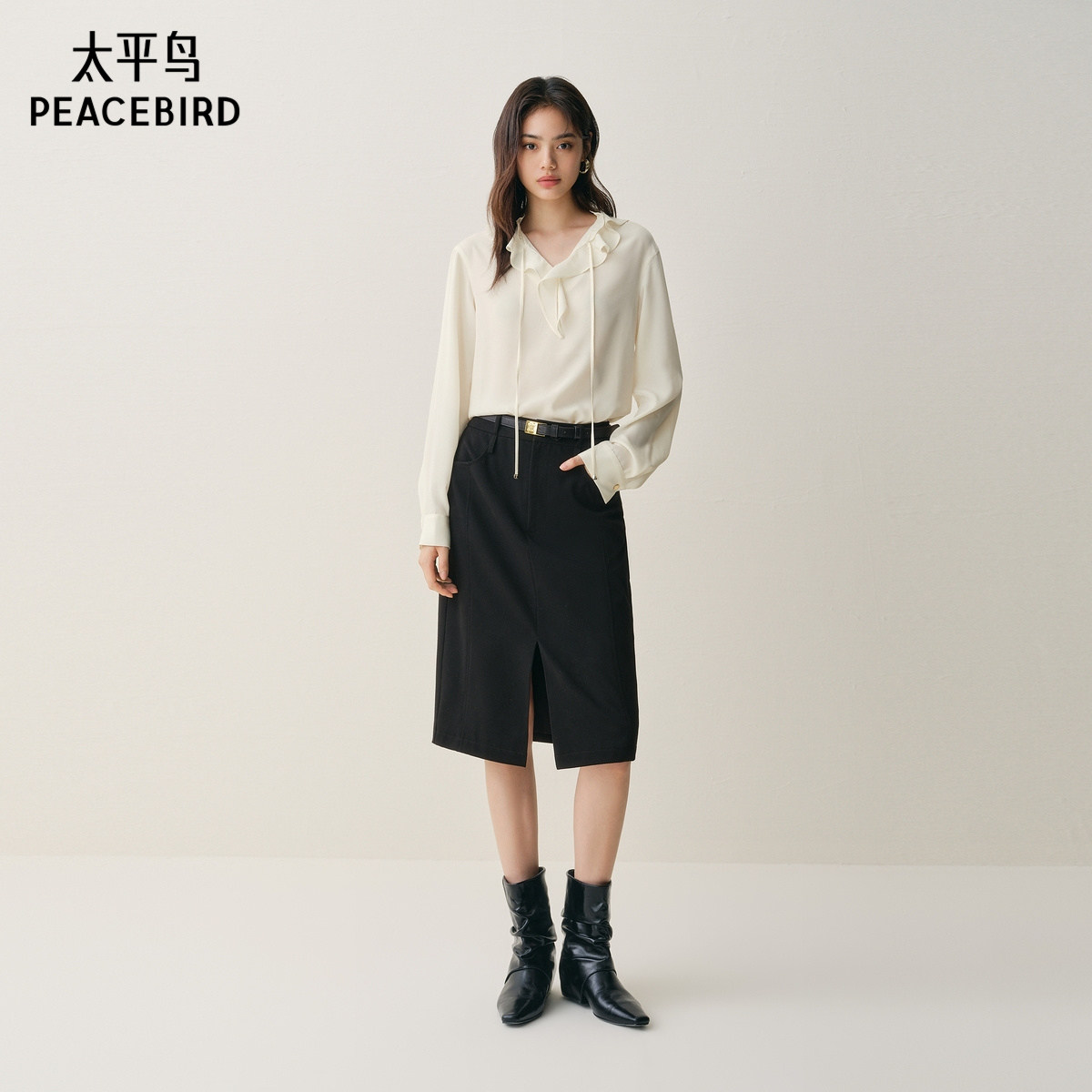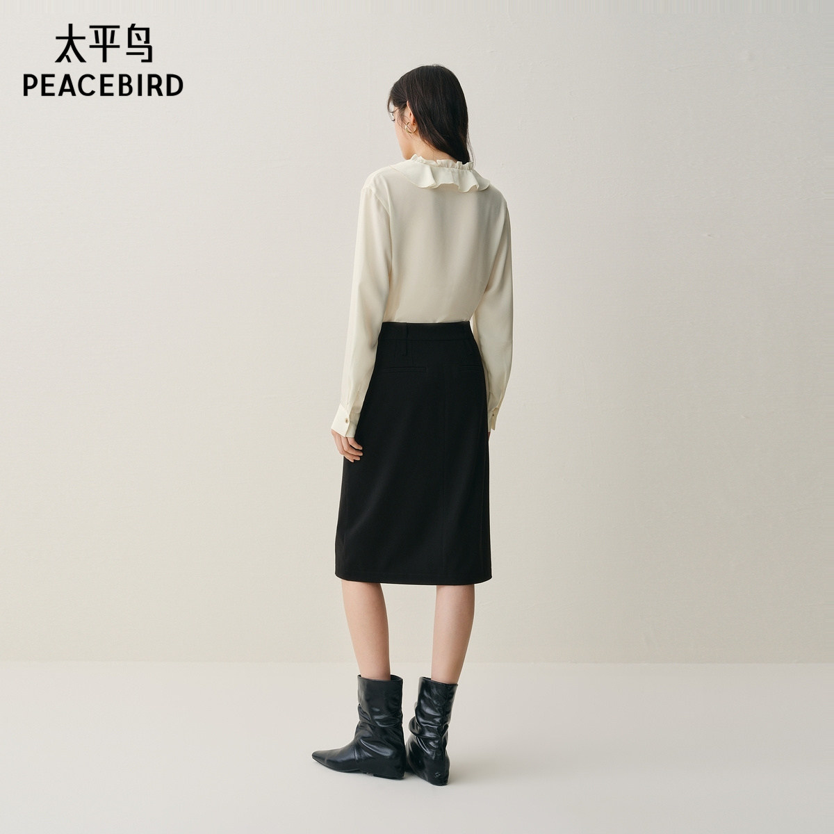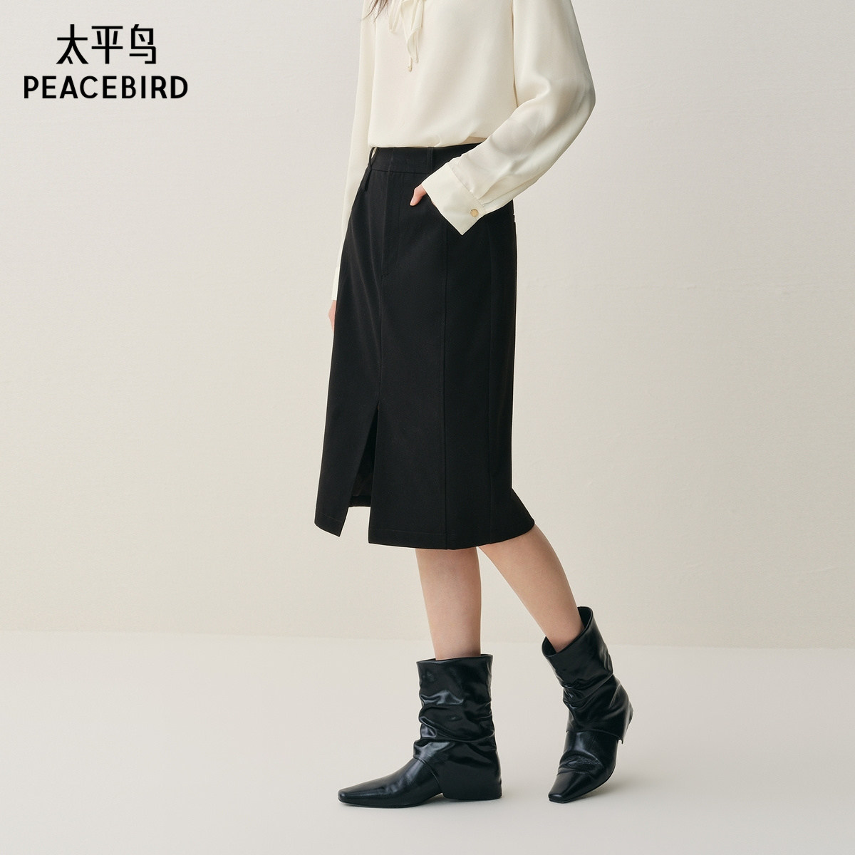 太平鸟黑色海妖裙半身裙长裙冬装新款弹力前开叉半身中长裙女*