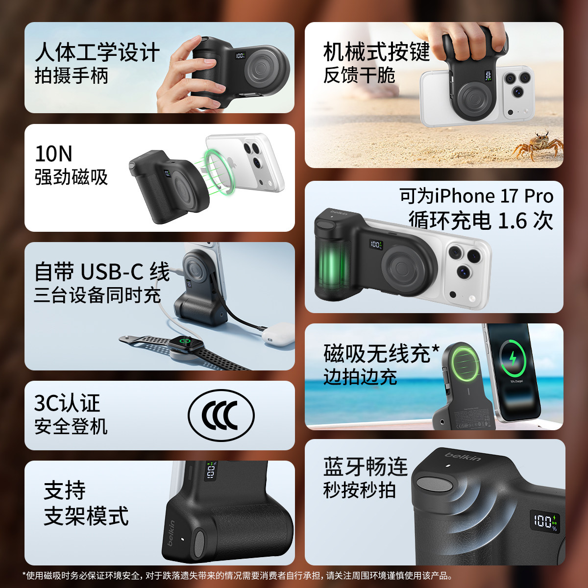Belkin贝尔金手机摄影磁吸充电拍摄手柄适用苹果17iPhone17ProMax助拍器无线蓝牙遥控拍充合一自带USB-C线