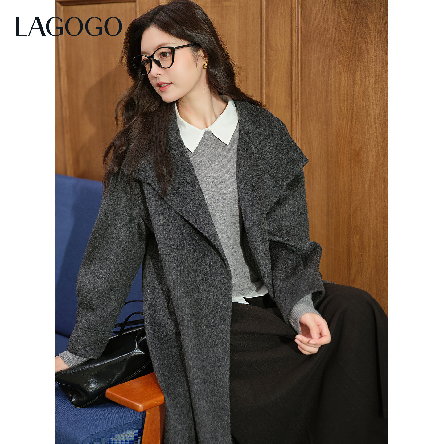 【全羊毛】LAGOGO长款翻领毛呢大衣女拉谷谷2025冬季新款深灰外套