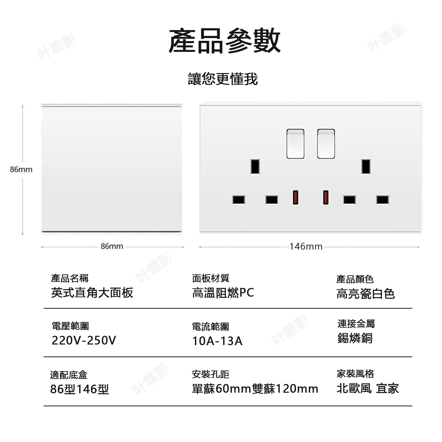 13A英标直角高亮度瓷白色电制苏英式LED灯开关英规墙壁插座大面板