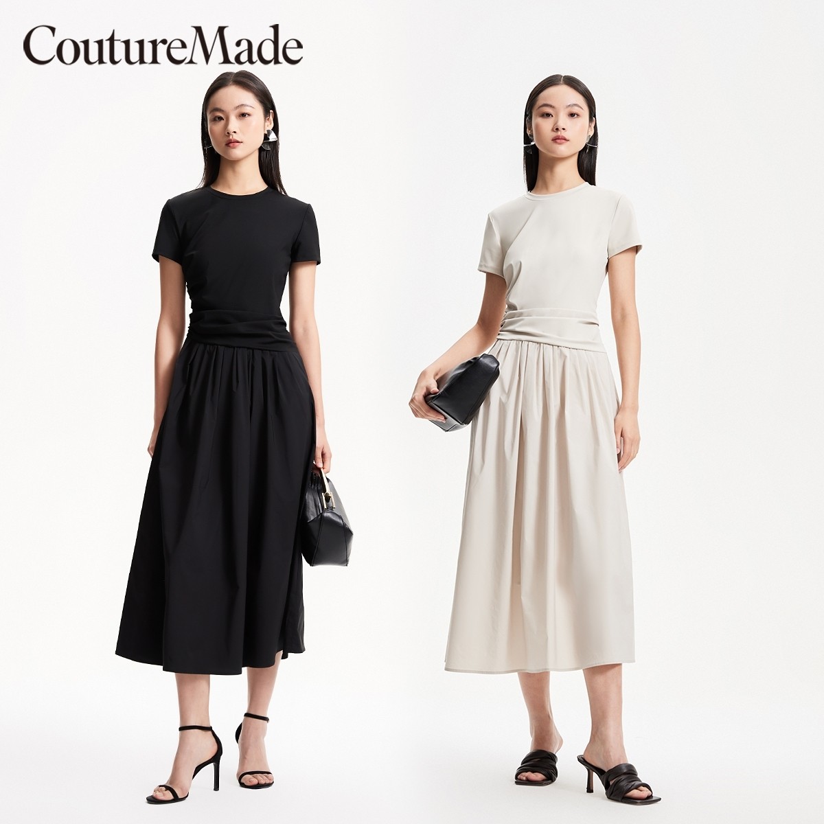 Couture Made连衣裙夏季圆领短袖褶皱长裙优雅时尚通勤32427B020