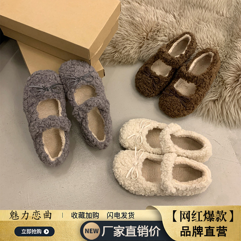 仙女风平底毛毛鞋女外穿2025秋冬新款蝴蝶结加绒保暖豆豆棉鞋瓢鞋