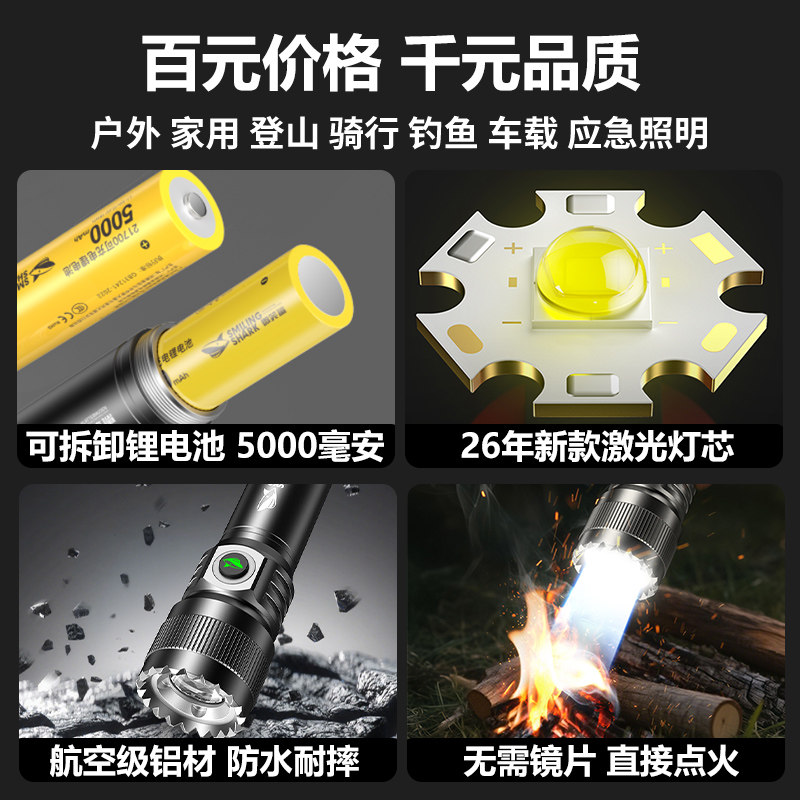 微笑鲨手电筒强光小型便携超亮长续航大容量远射充电式家用户外