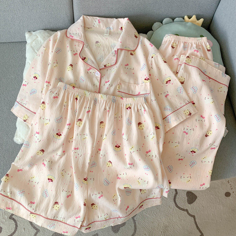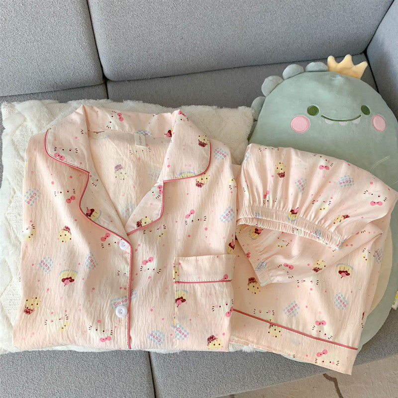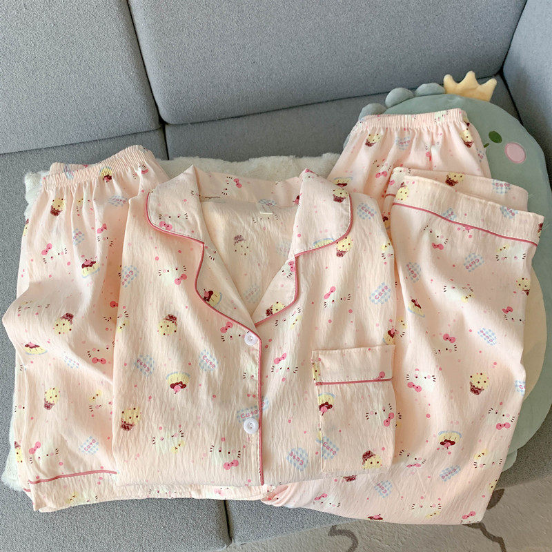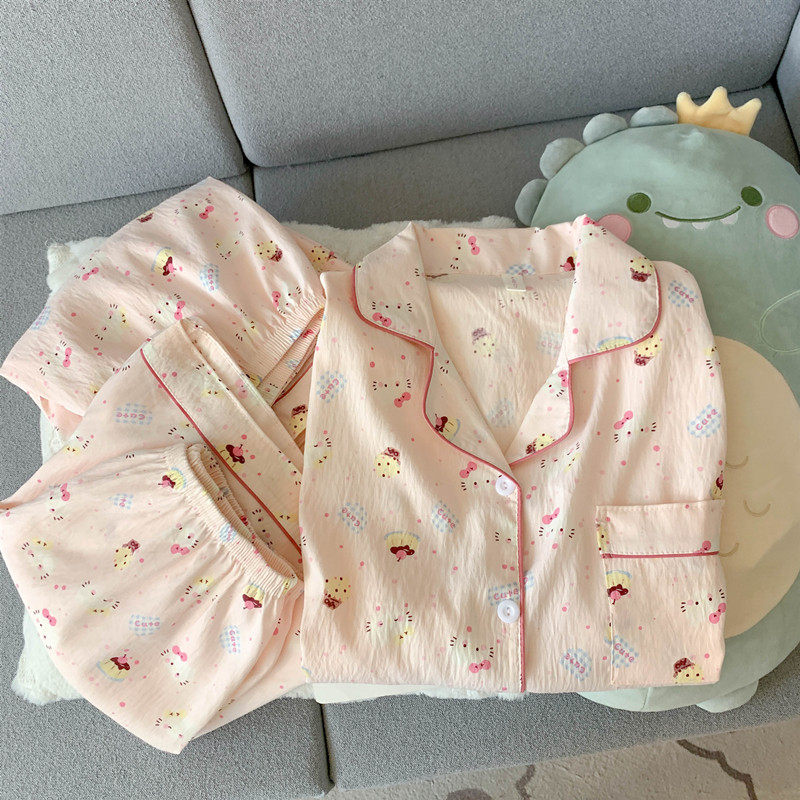 红豆网红风猫咪云朵纯棉纱睡衣女款夏季学生可爱少女家居服短袖三