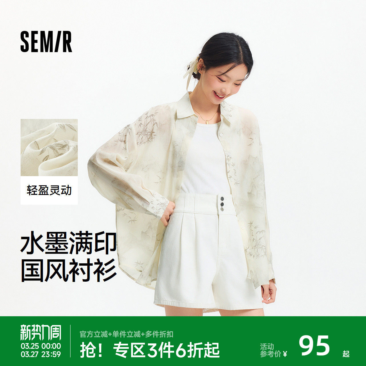 森马长袖衬衫女中长款上衣简约松弛感2025夏新款水墨满印衬衣国风