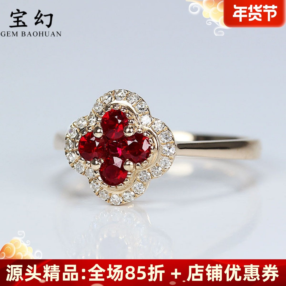 18k玫瑰金天然鸽血红宝石幸运四叶草戒指 深红色伴钻石指环套装