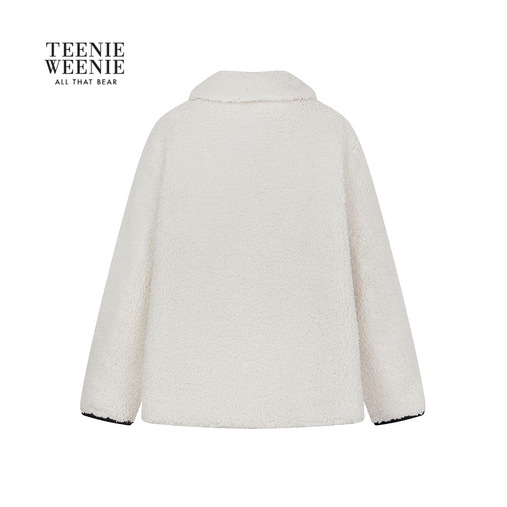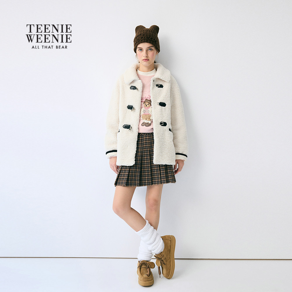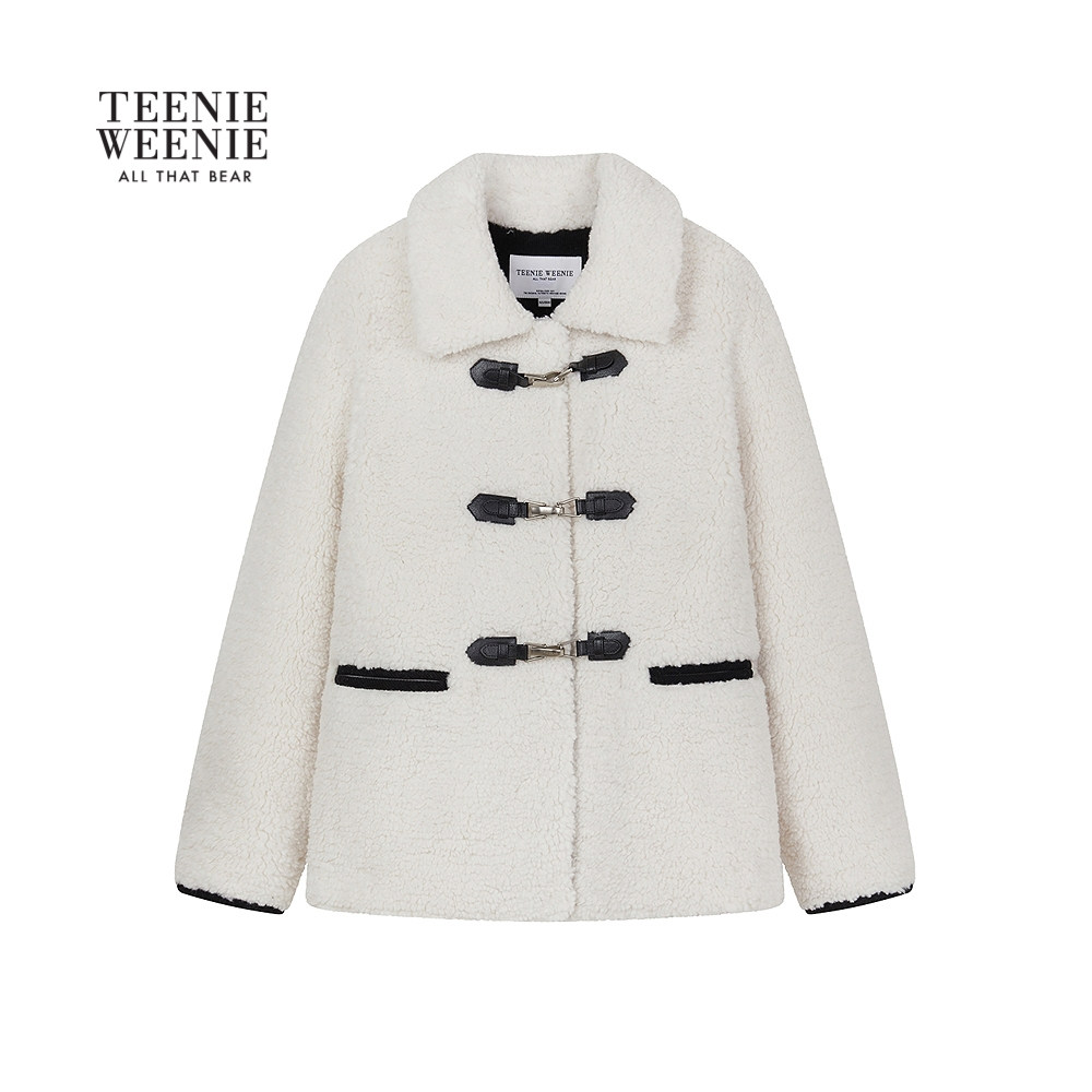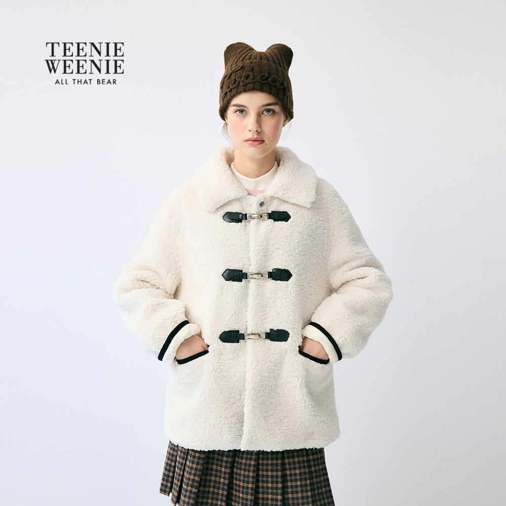 TeenieWeenie小熊女装外套2025秋季新款简约舒适皮革环扣毛呢大衣