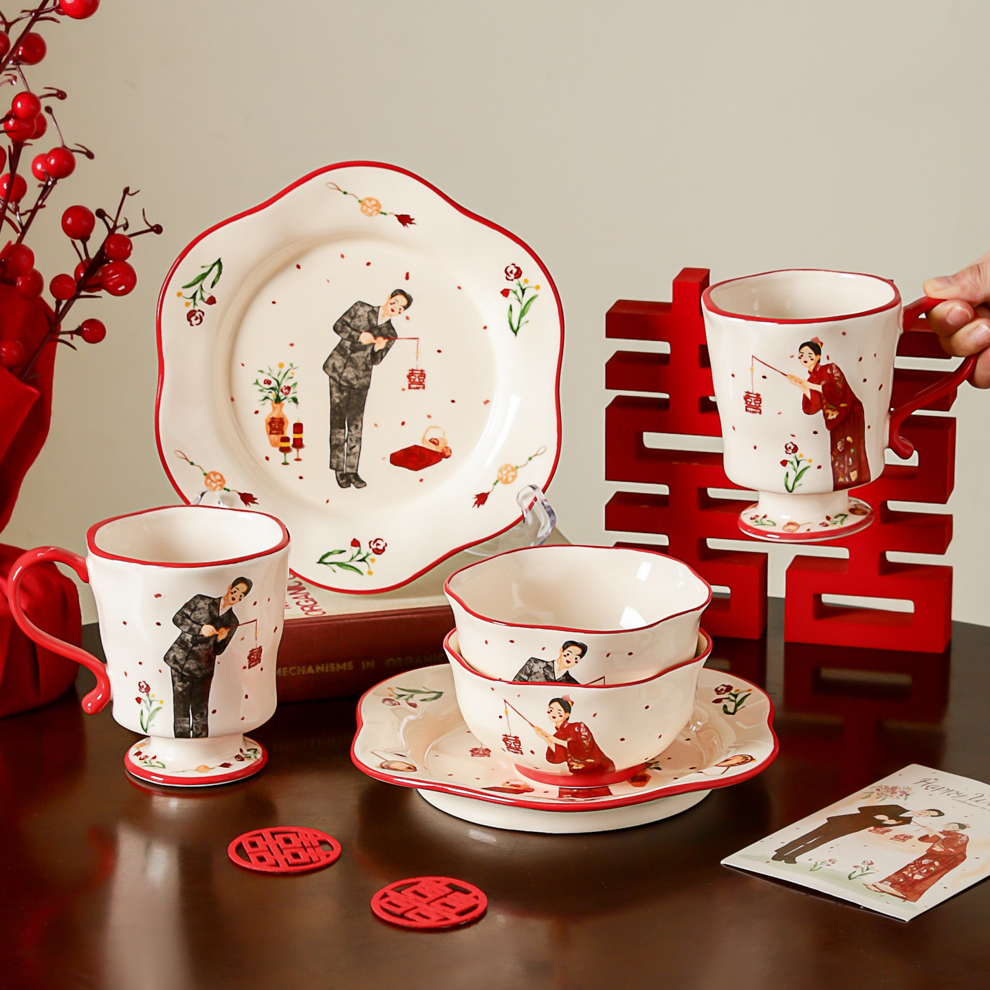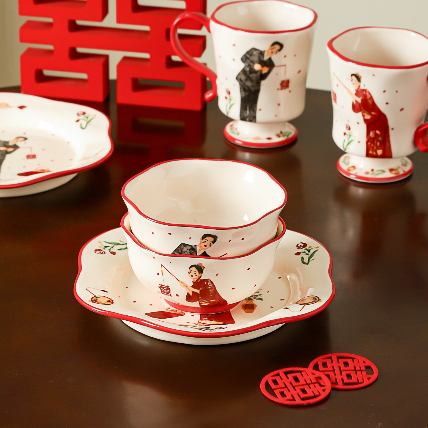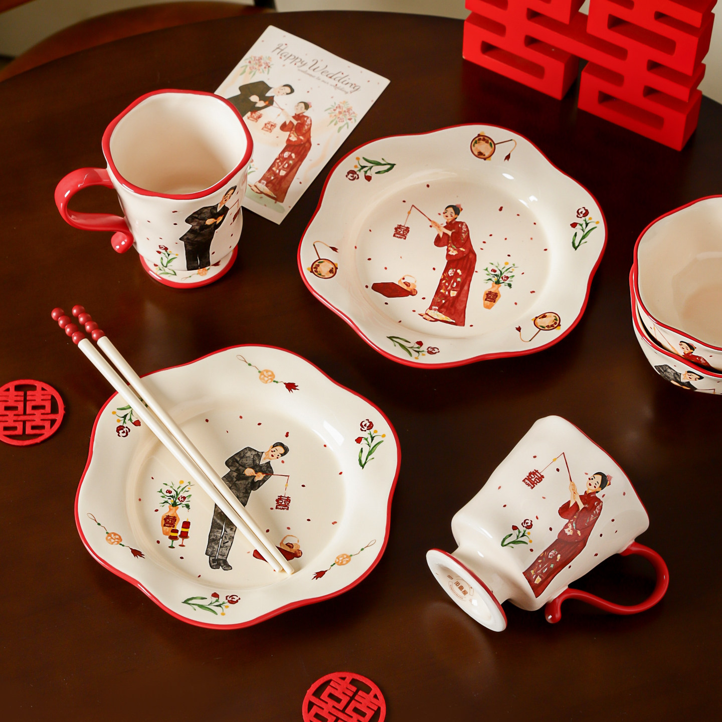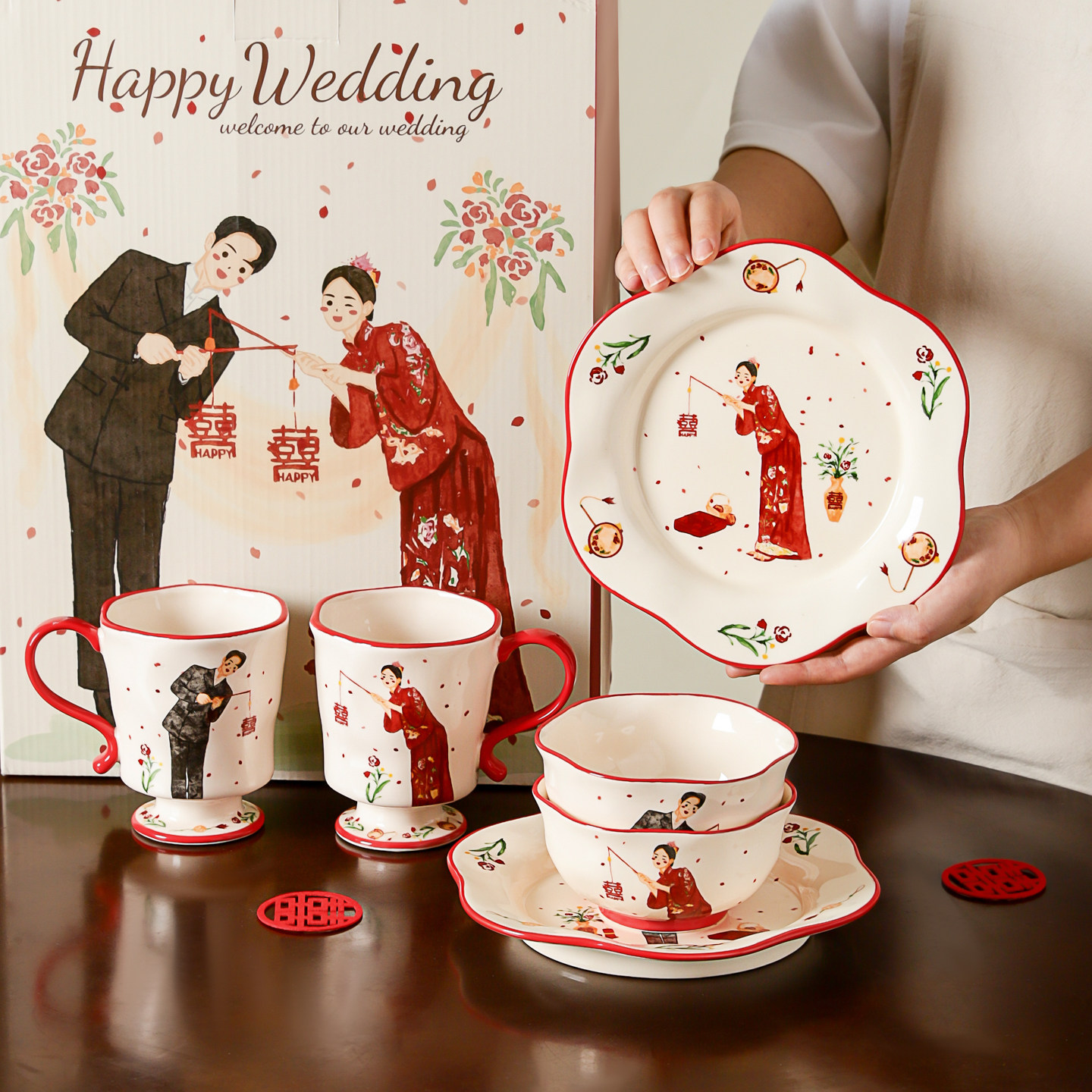 高档碗碟餐具陶瓷新婚礼物送新娘红色碗盘筷套装乔迁新居结婚礼盒