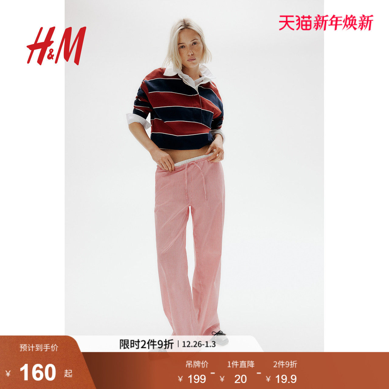 HM女装家居裤2025年冬季新款直筒简约红色双腰头府绸睡裤1270295