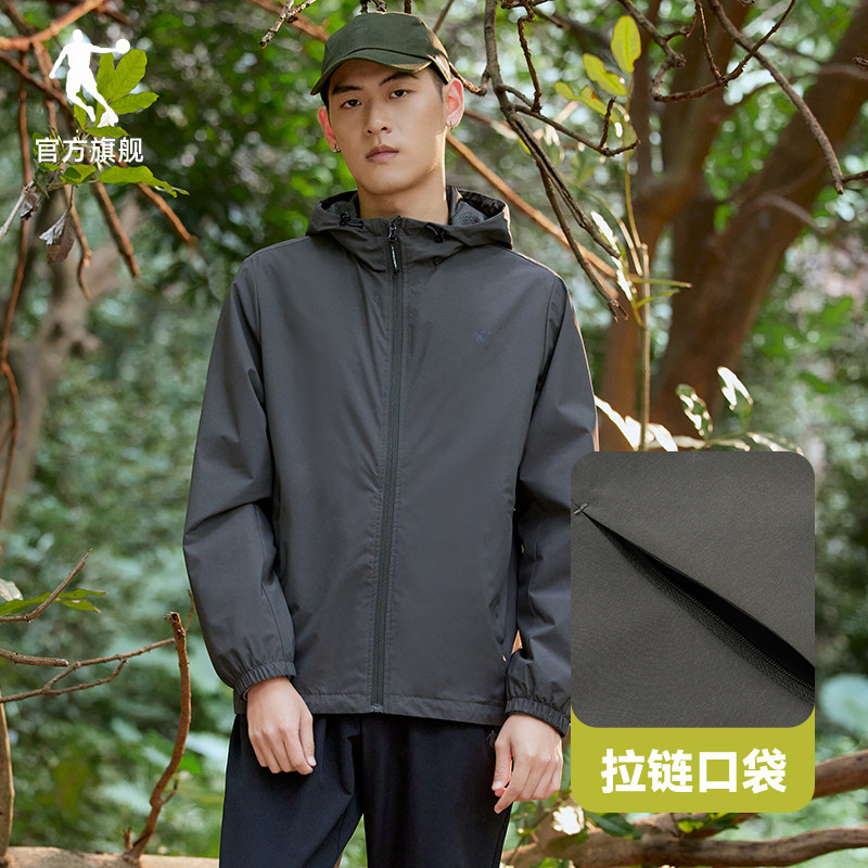 特步防泼水夹克外套男春秋季户外风衣连帽黑色上衣防风运动训练服