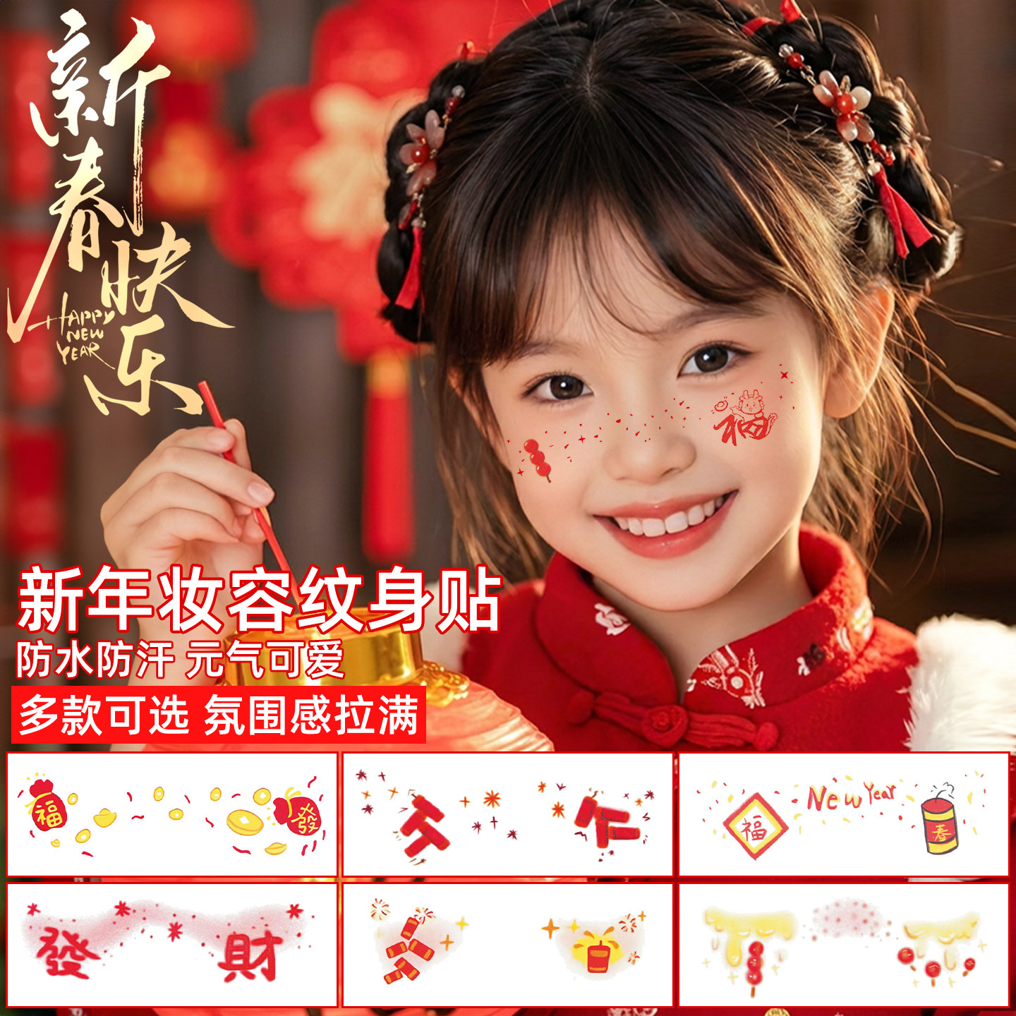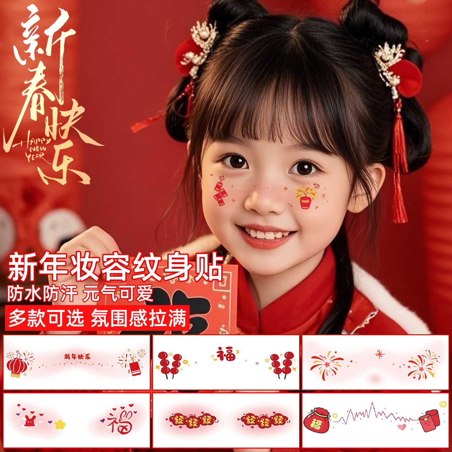 新年儿童妆容贴纸新款拍照红包拜年过年氛围感可爱糖葫芦纹身贴春节元旦脸部小女孩表演彩绘化妆写真粘贴画