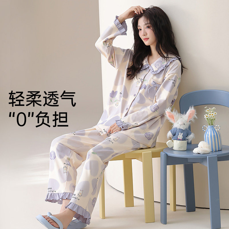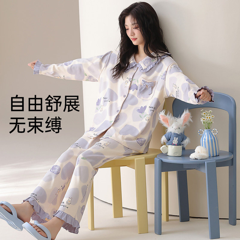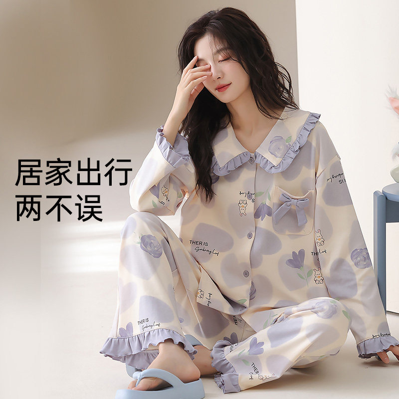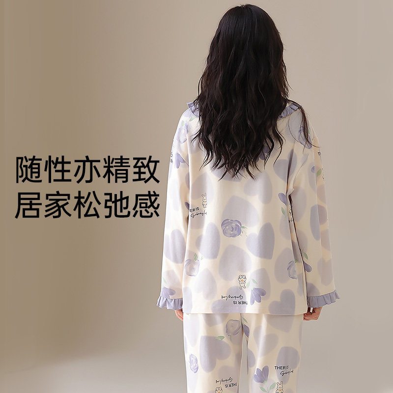 润微睡衣女100%纯棉睡衣女款春秋长袖家居服套装女士睡衣女可外穿