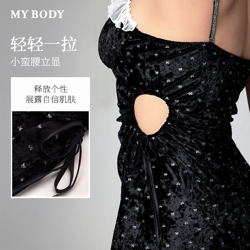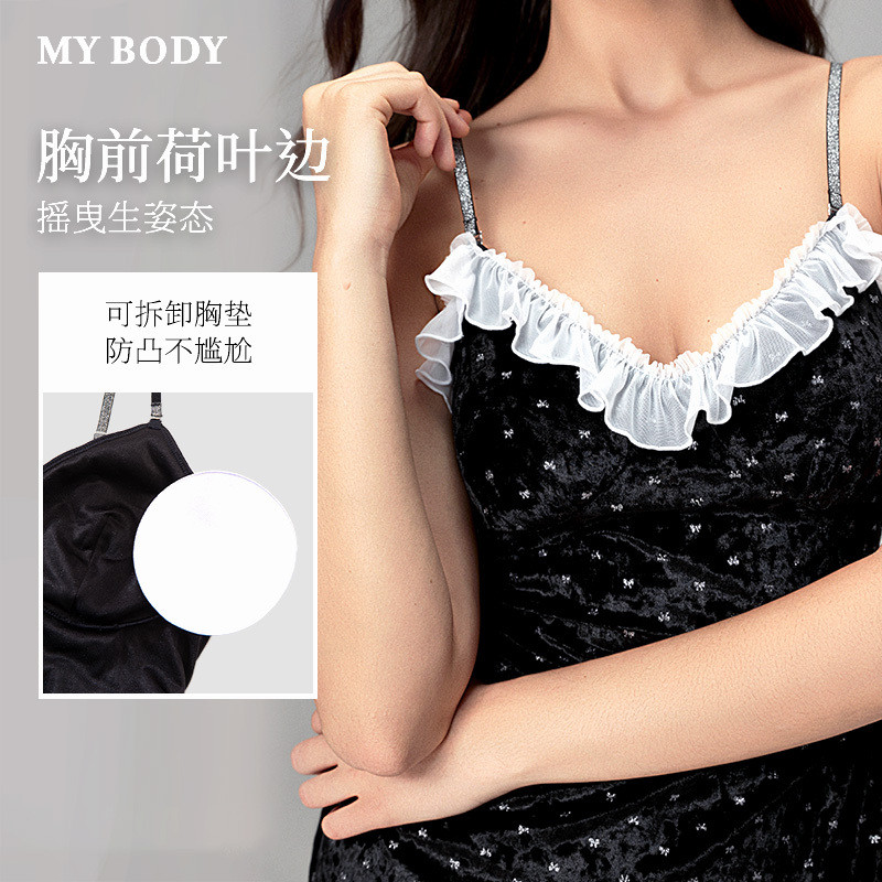 MYBODY商场同款秋季新款带胸垫荷叶边银丝优雅轻奢烫银丝绒吊带裙