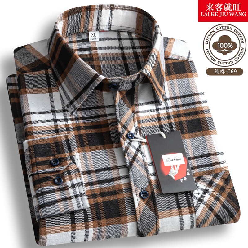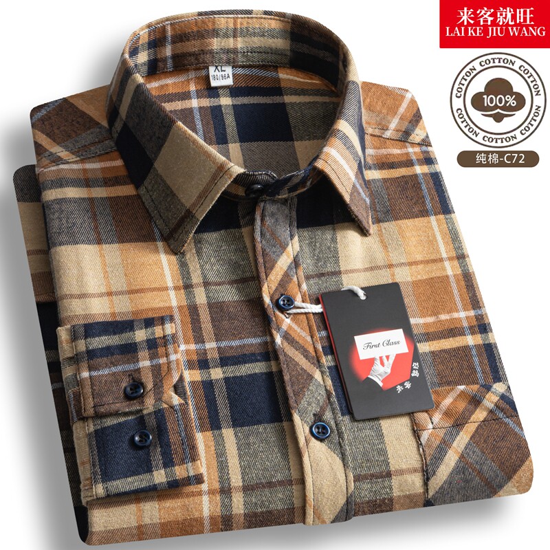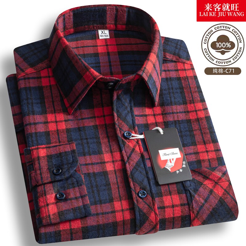纯棉100男士长袖格子衬衫透气商务休闲爸爸装复古不缩水免烫衬衣