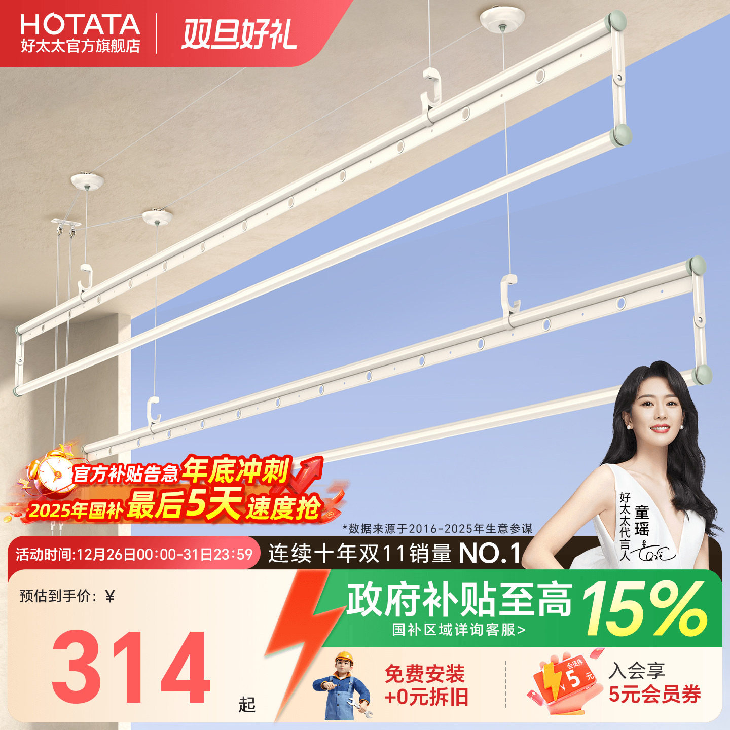 【政府补贴】好太太晾衣架手摇升降晾衣杆室内阳台家用手动凉衣架