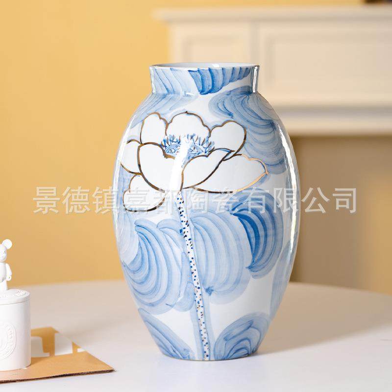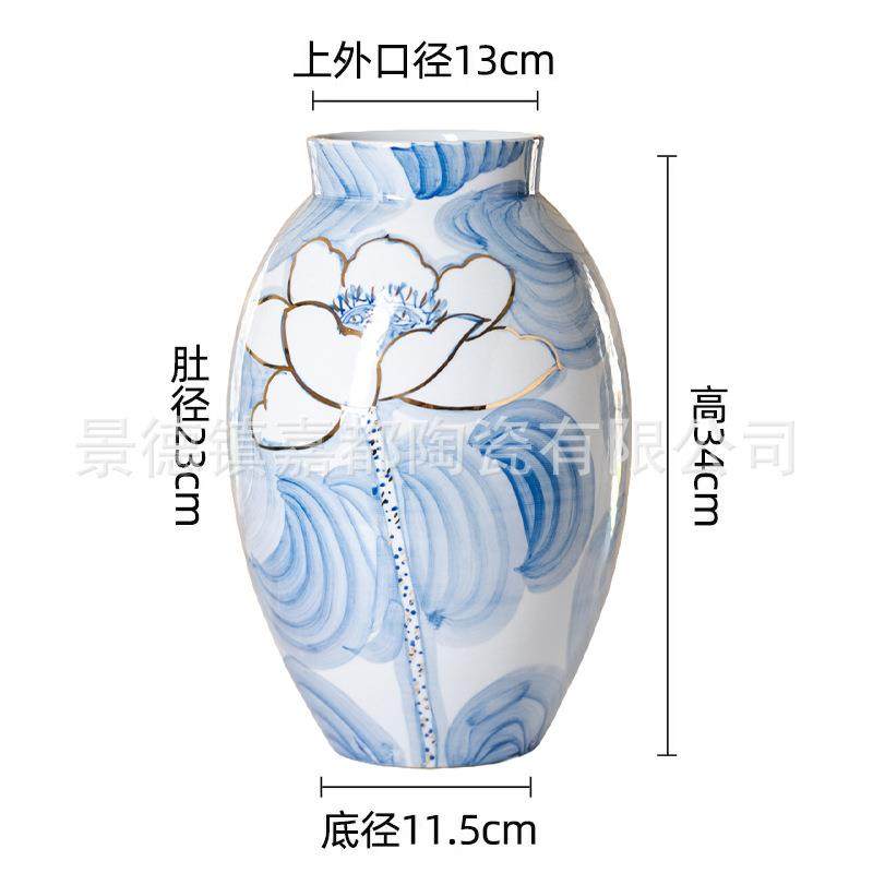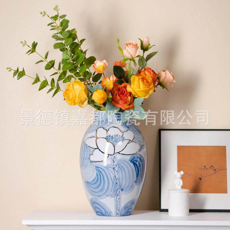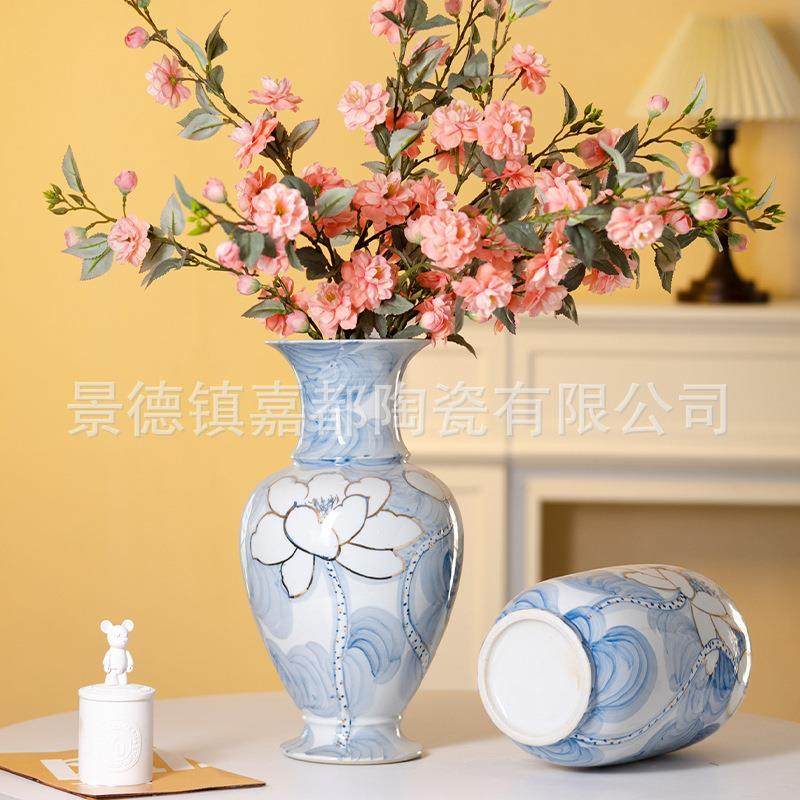 新中式手绘描金陶瓷花瓶摆件客厅酒店样板房软装饰轻奢青花瓷花瓶