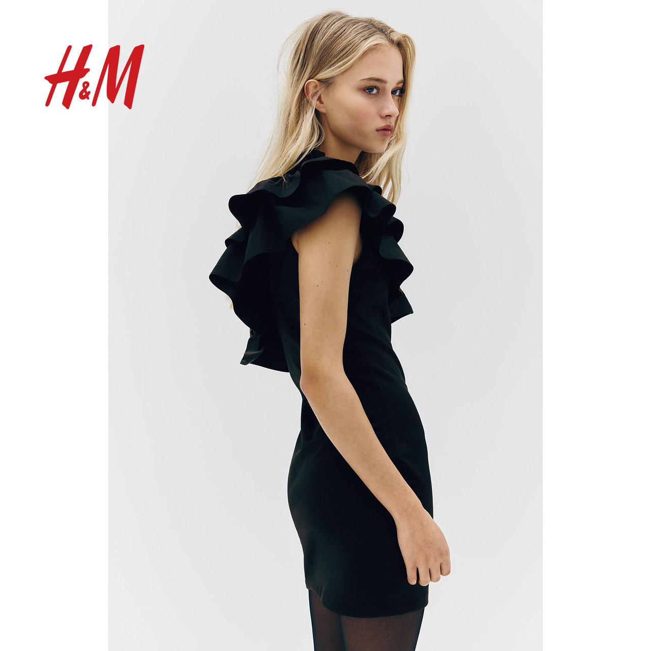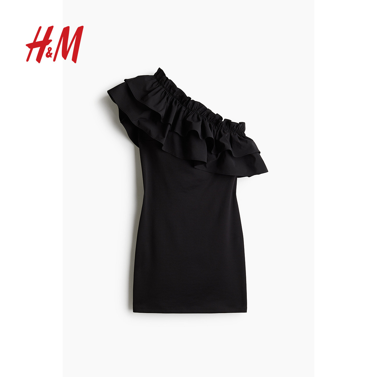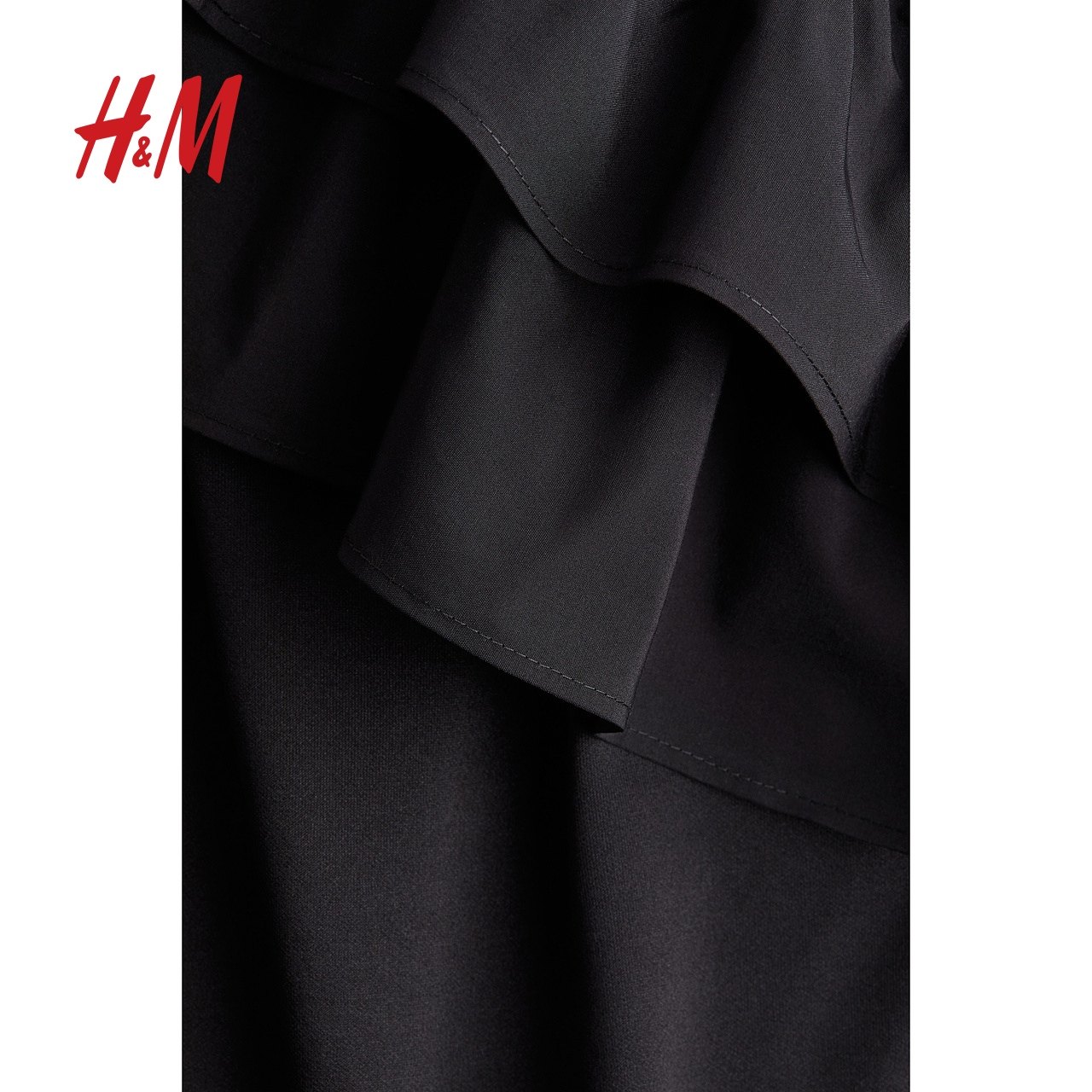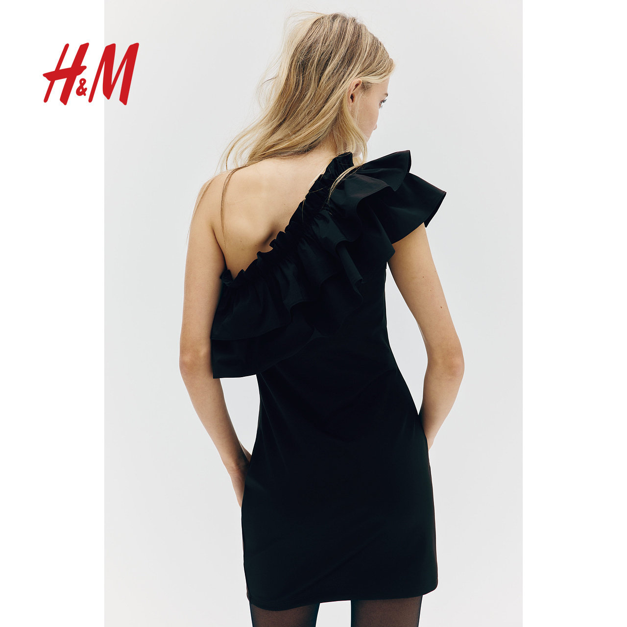 HM女装连衣裙冬季时尚褶边礼服单肩不规则长裙party小礼裙1275823