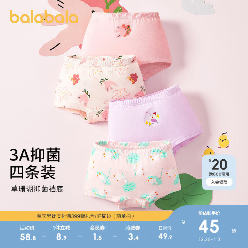 巴拉巴拉女童内裤平角儿童四角短裤宝宝不夹PP男童平角四条装抑菌